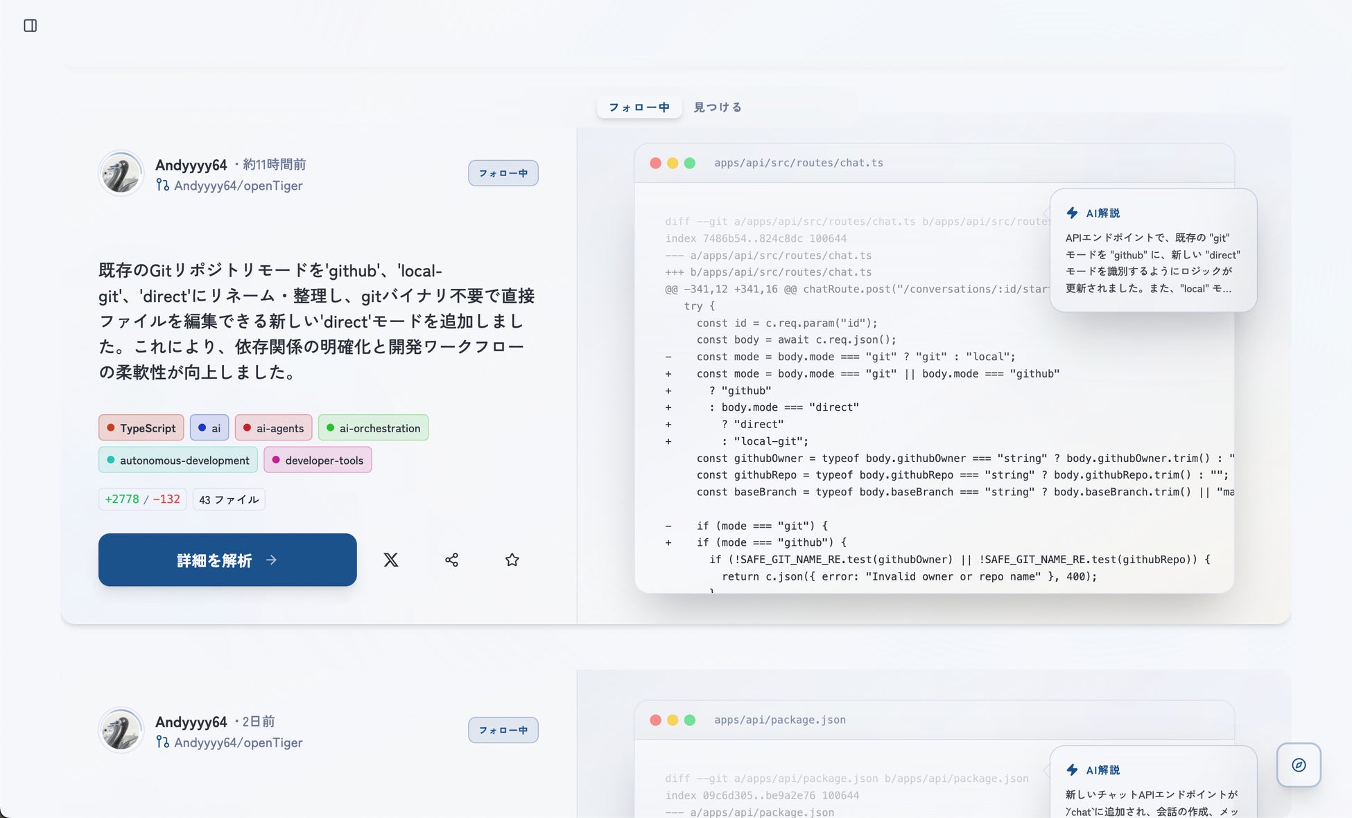 Gitty Exploreは、世界中の急成長リポジトリと、Gitty登録開発者の最新GitHub活動を組み合わせたフィード形式の発見体験を提供します。AIが開発者のコード変更を解析し、実装・設計・活動パターンをリアルタイムで可視化することで、開発者同士の相互学習と刺激の場を創出します。