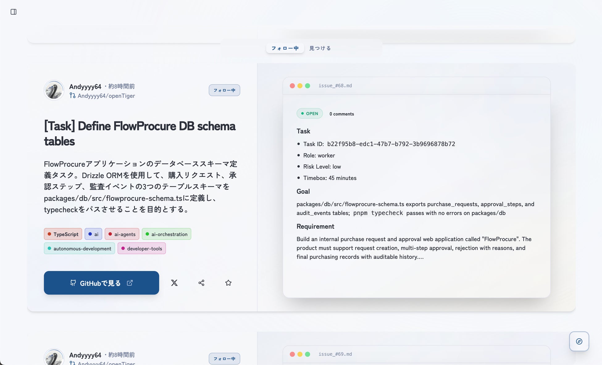 フィードはシンプルに2つのモードで構成されています。「フォロー中」ではフォローしている開発者の最新活動が時系列で表示され、「見つける」では世界中の急成長リポジトリとGittyユーザーの活動が混在した発見フィードを表示します。検索バーから技術タグや言語で絞り込みを行い、特定の技術領域に取り組んでいる開発者を素早く発見することもできます。