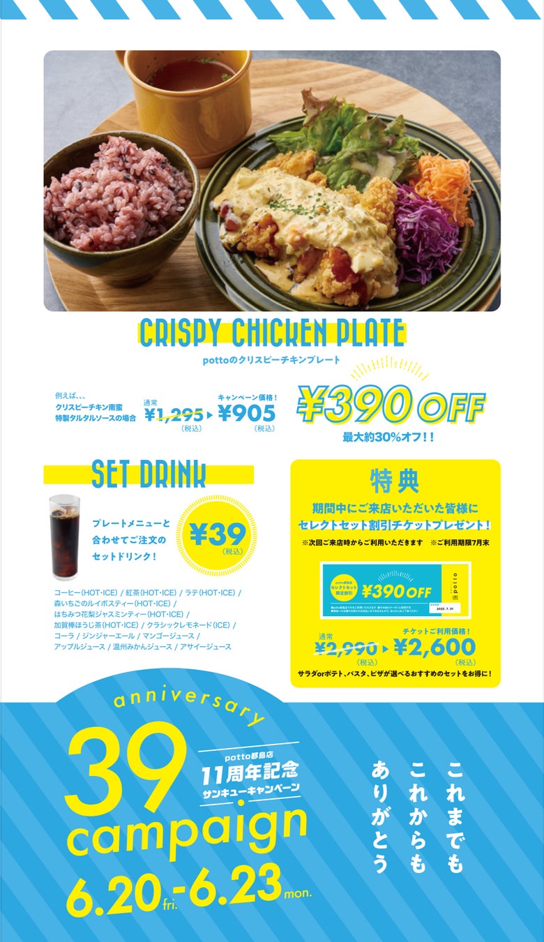 地域の皆様に感謝を込めて【11周年の特別な4日間】pottoのクリスピーチキンプレート390円OFF!!