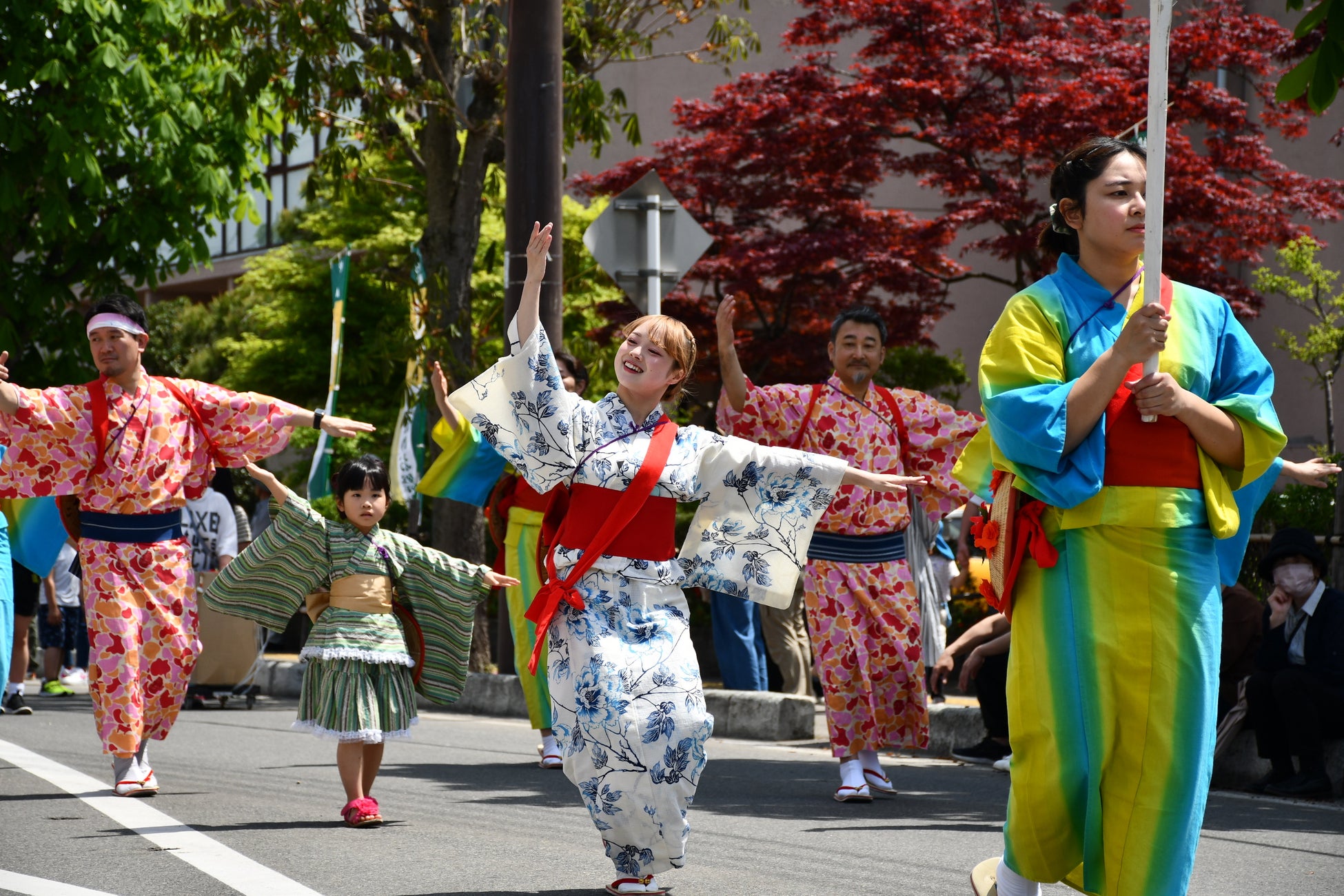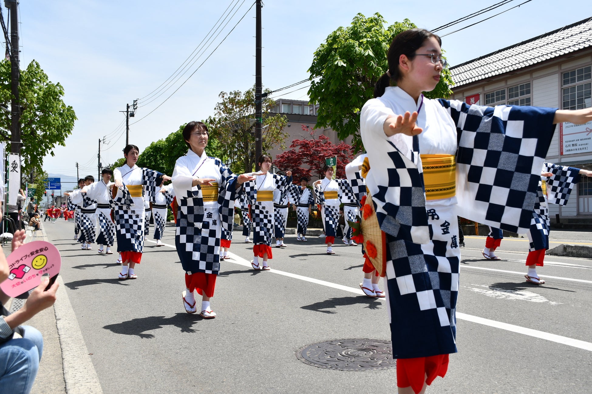 米沢市内の舞踊集団や学校、企業グループなどの方々が参加し、満開の桜の下、千人もの踊り手が色とりどりの衣装で華やかに踊り歩きます。
