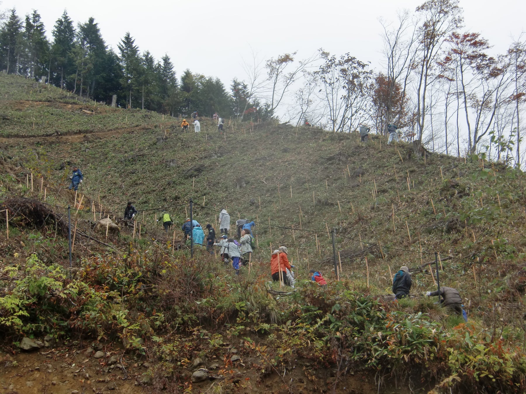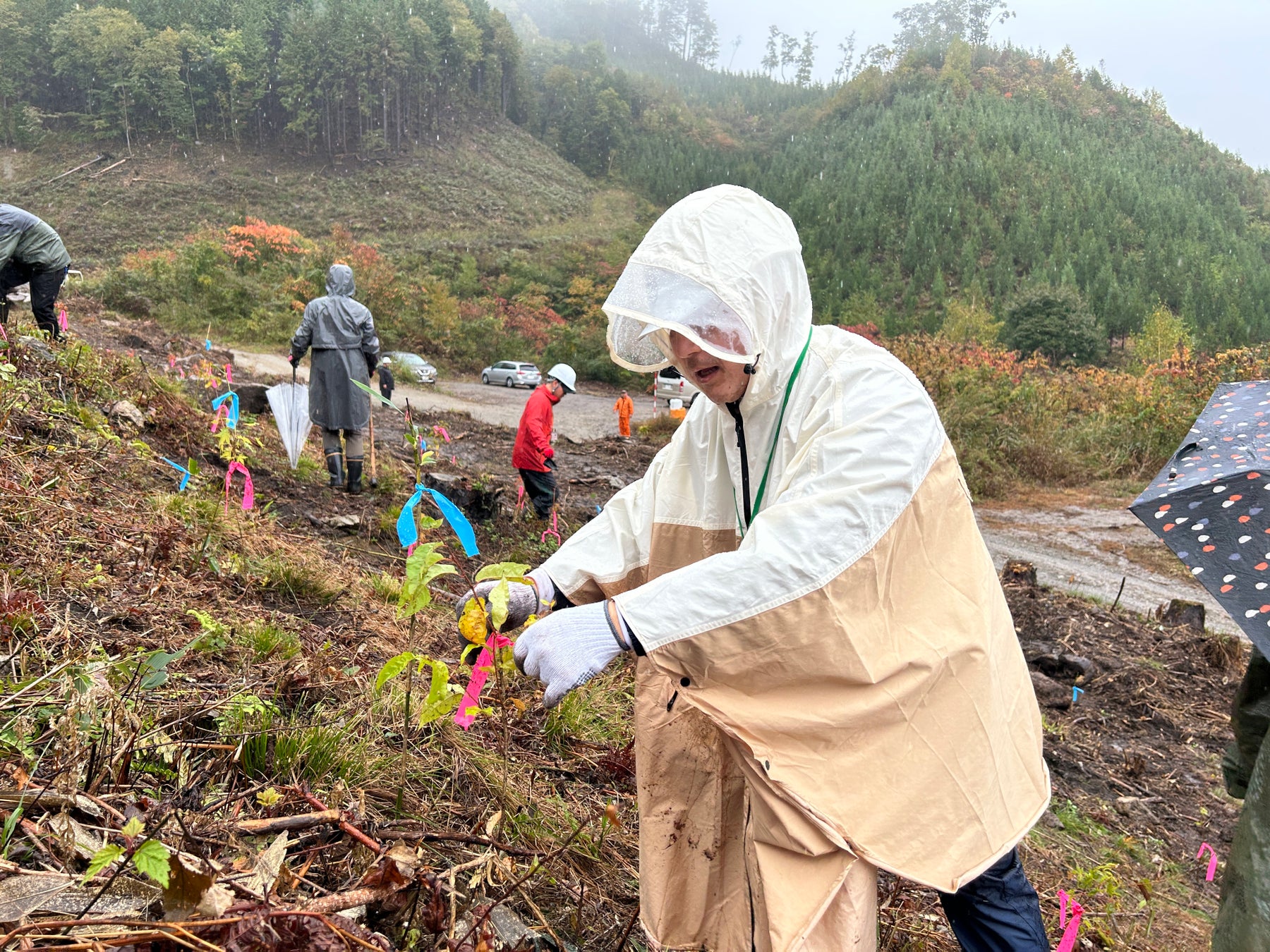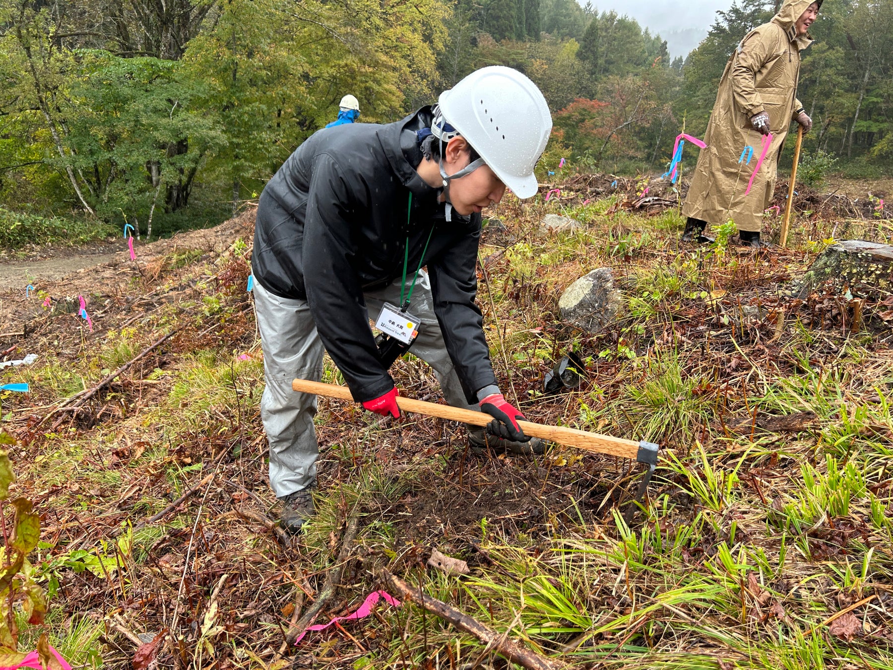 植樹祭では、地元植生の広葉樹であるイタヤカエデとヤマザクラを合計100本植樹。生憎の雨模様となりましたが、参加者からは「しっかりクワを使って植えることができて楽しかった」「飛騨高山の森に愛着が沸きました」といったポジティブな声が多く寄せられました。