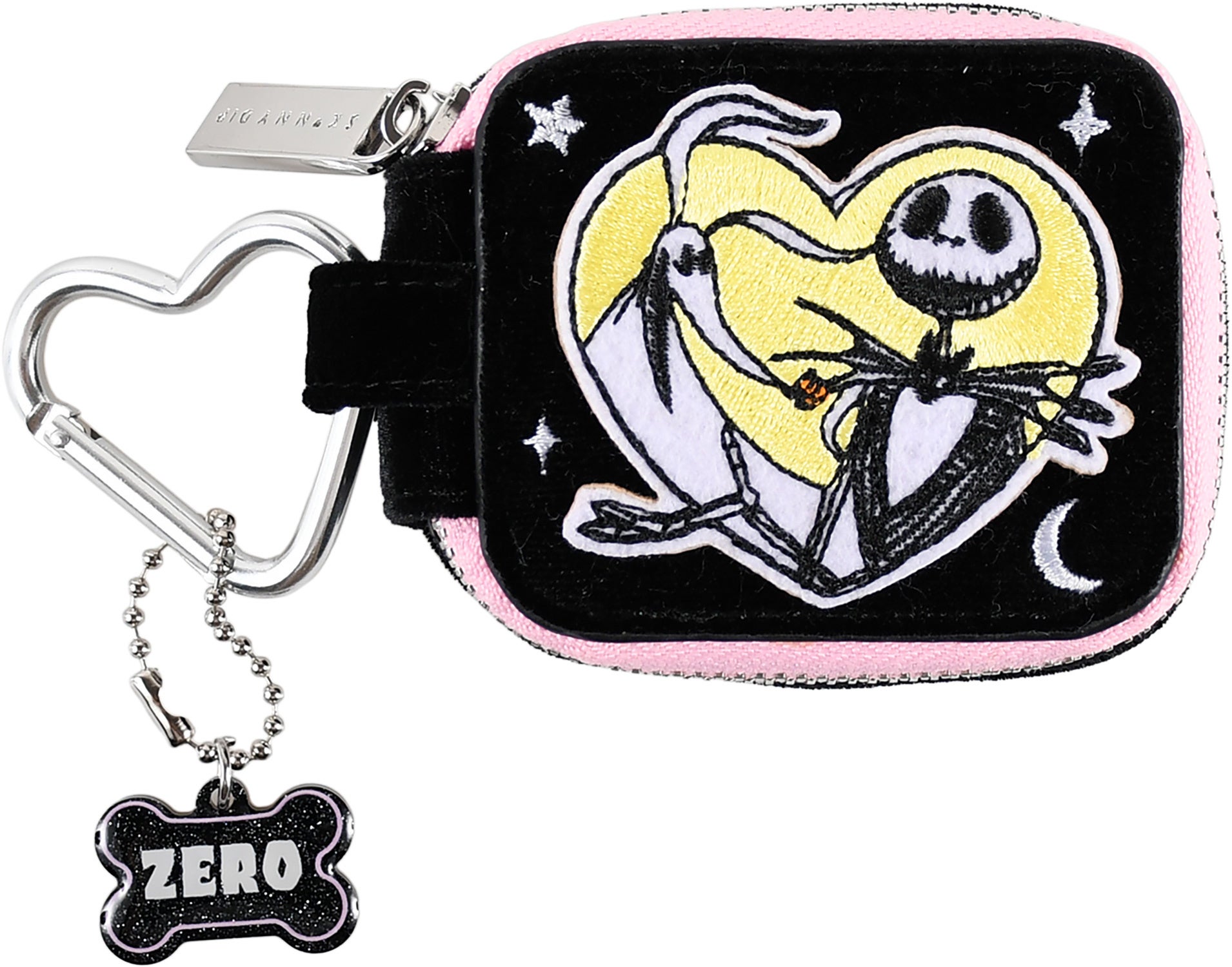ベロア素材のポーチ型ケースにジャック・スケリントンとゼロを刺繍でデザイン。ワイヤレスイヤホン以外にも小さな小物が入るカラビナ付きミニポーチ。