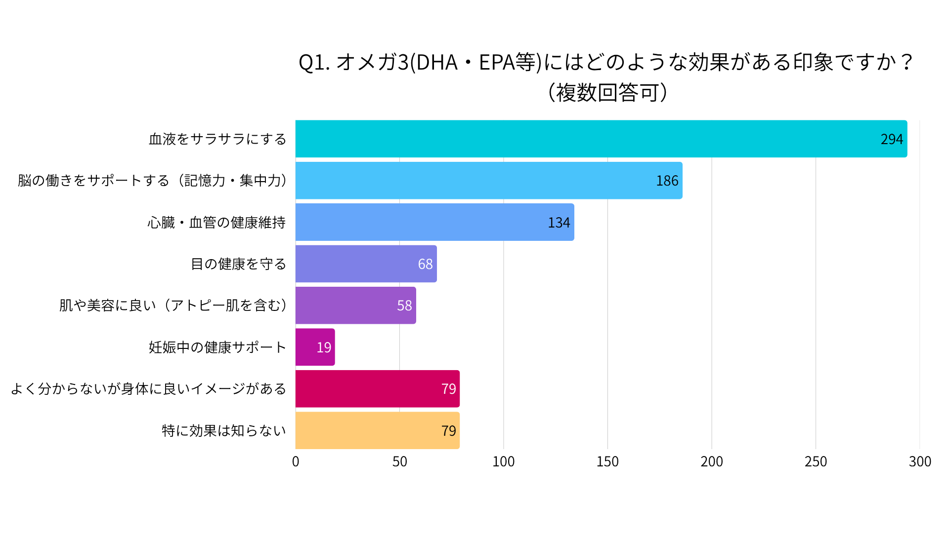 本調査(n=500)では、オメガ3のイメージとして「血液をサラサラにする」が回答者の半数以上を占め、効果に関する一定の理解が広がっている様子がうかがえました。