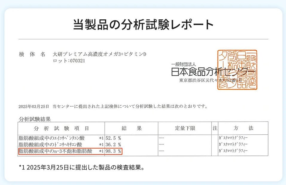 弊社はこうした課題を踏まえ、国内最高水準級のオメガ3濃度98.3%(n-3系不飽和脂肪酸)という高純度品質を実現した「DHA&EPA+ビタミンD」を提供しています。