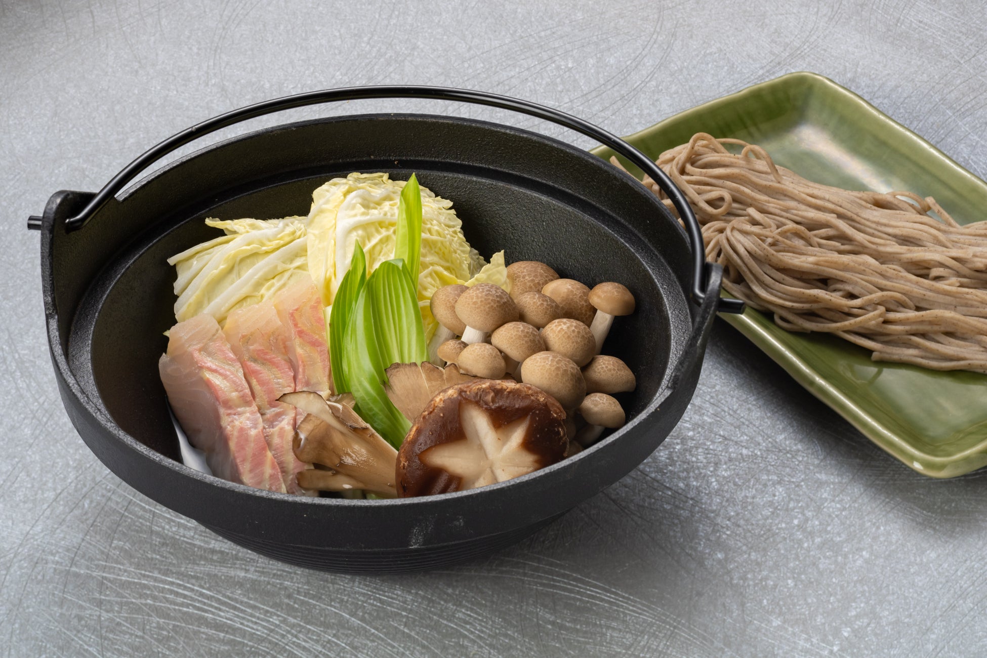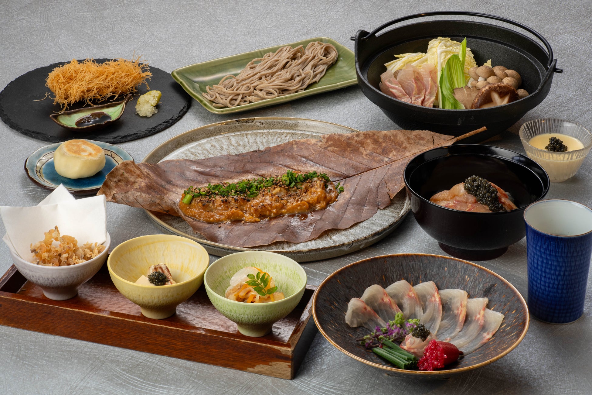 ・チョウザメ出汁蕎麦:鍋の締めは信州蕎麦を合わせます。チョウザメときのこの旨みが詰まった出汁をかけてお召し上がりください。