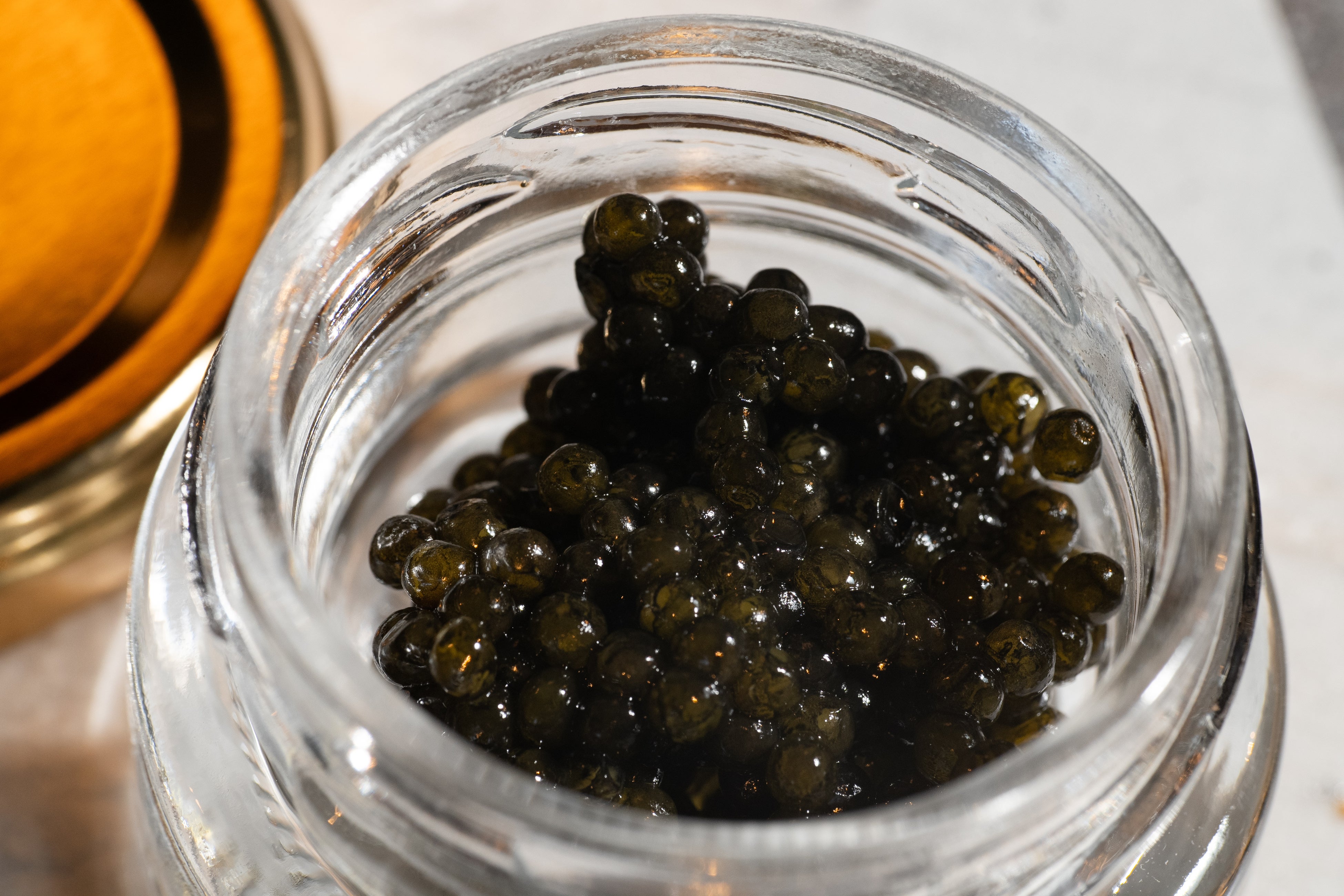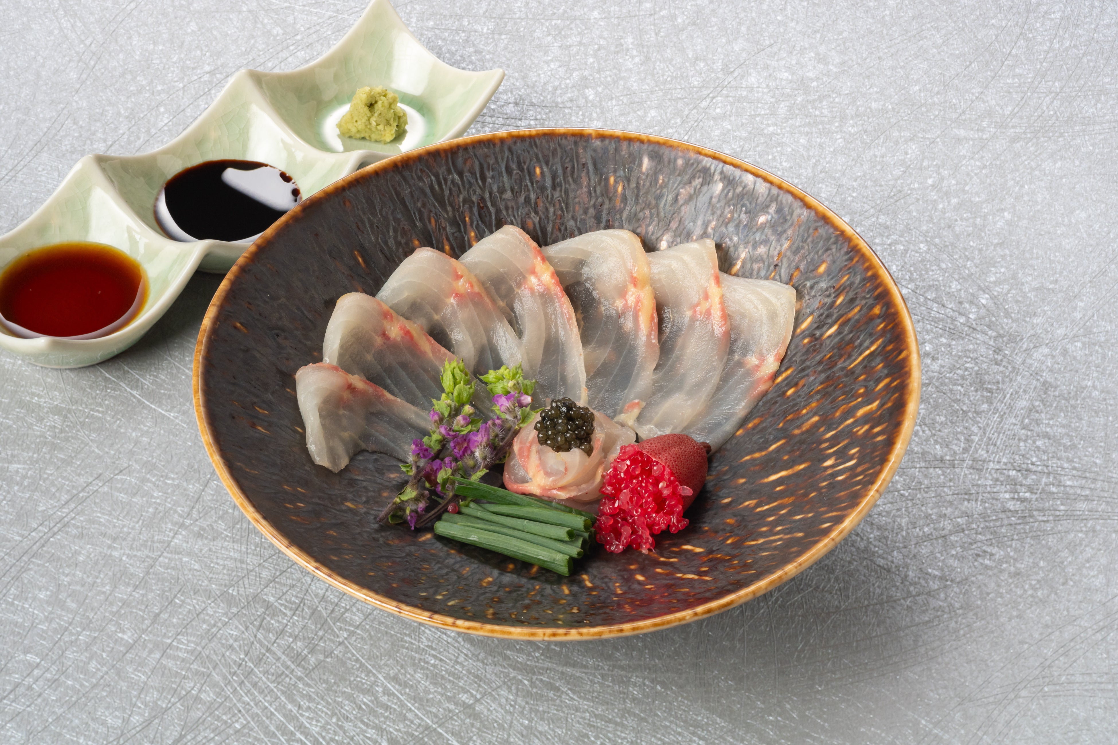 ・チョウザメのお造り:クセもなくコリコリの食感を楽しんでいただくために、あえてシンプルなお造りに仕上げました。フィンガーライムとキャビアと共にお楽しみください。