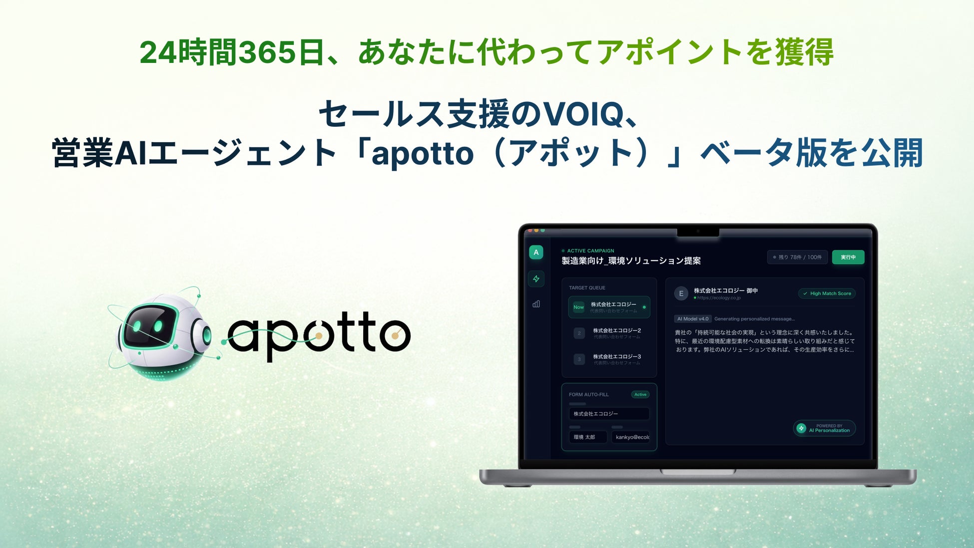 AIを活用したセールス支援事業を展開しているVOIQ株式会社(本社:東京都港区、代表取締役:高田 恵、以下VOIQ)は、営業活動におけるアポイント獲得業務を自動化する営業AIエージェント「apotto(アポット)」のベータ版を公開したことをお知らせします。