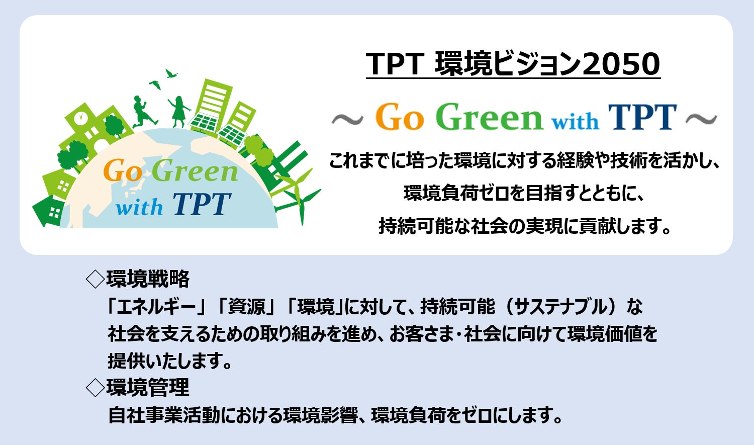 当社は、これまで培ってきた技術力と現場での経験を活かし、「環境負荷ゼロ」を目指すとともに、「持続可能な社会の実現」に向け、長期的な環境戦略「TPT環境ビジョン2050 ~Go Green with TPT~」を掲げています。