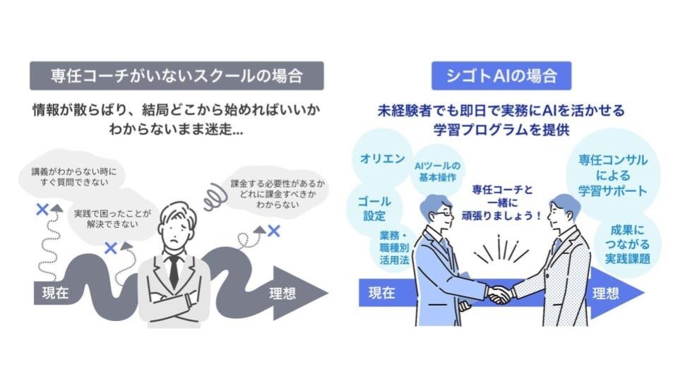 シゴトAIは、進化の早いAIが日本に台頭し情報が溢れ、実務での活用を前提とした学習機会が限られているという課題を背景に、学習内容を「即」仕事に活かせる実務特化型のAI教育スクールとして提供されています。