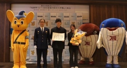 本学は警視庁麹町警察署(東京都千代田区)と2024年1月に締結した「麹町パートナーシップ」の一環として、15分間の震災対策教育ビデオドラマ『地震博士と!とある家族の防災大作戦』を制作しました。映像の完成にあたり11月5日、城西国際大学東京紀尾井町キャンパスにて、完成披露上映会および警視庁麹町警察署 占部貴之署長より、制作に携わった学生たちへ感謝状が贈られました。