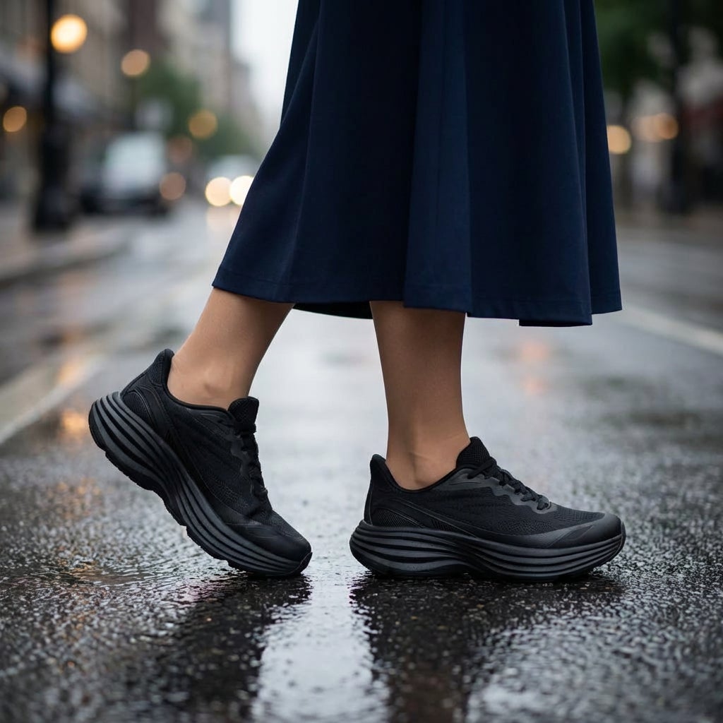 本製品は、防水機能を目的としたものではなく、雨の日の横断歩道、駅構内の濡れた床、雪解け道など、日常の中にある「滑りやすい環境」において、歩行時の安定性に配慮して設計されたシューズである。