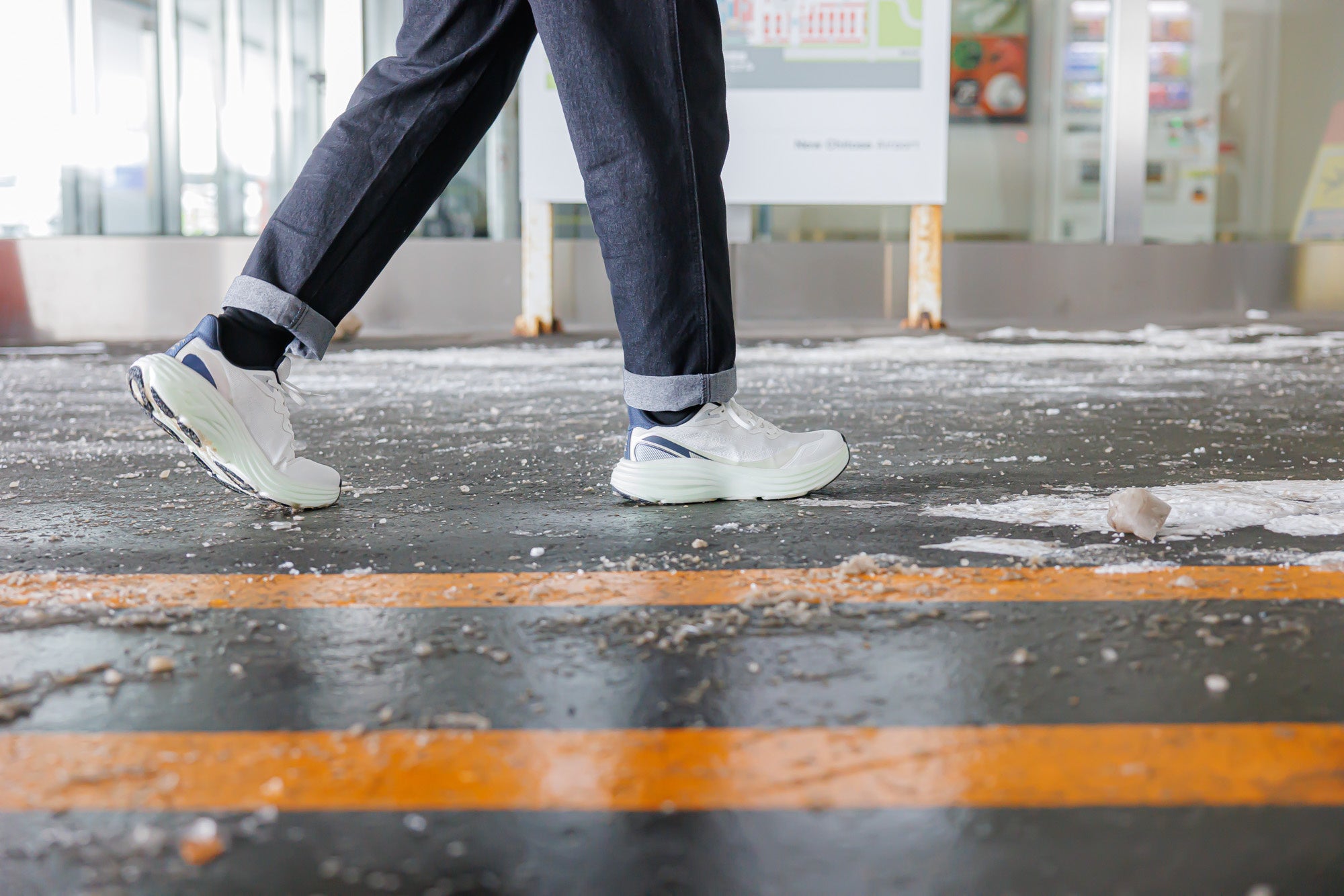 雨の日の横断歩道や駅の床、雪解けの路面など、日常には“滑りやすい場面”が数多く存在する。北海道出身者の実体験を起点に、そうした日常の不安に向き合って設計された厚底シューズ。