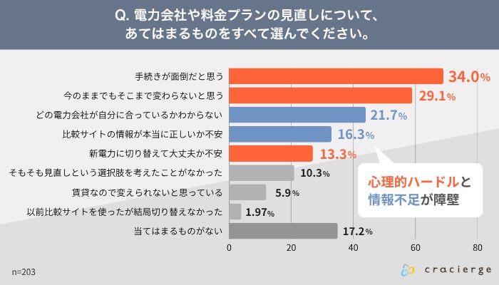 電力会社の見直しを阻む壁。「面倒」が34.0%で最多、「わからない」「不安」も上位に
