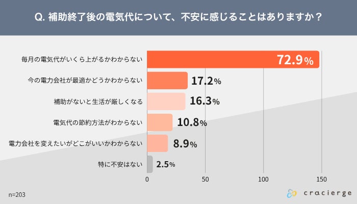 補助終了後の電気代について不安に感じることを聞いたところ、「毎月の電気代がいくら上がるかわからない」が72.9%で圧倒的な1位でした。