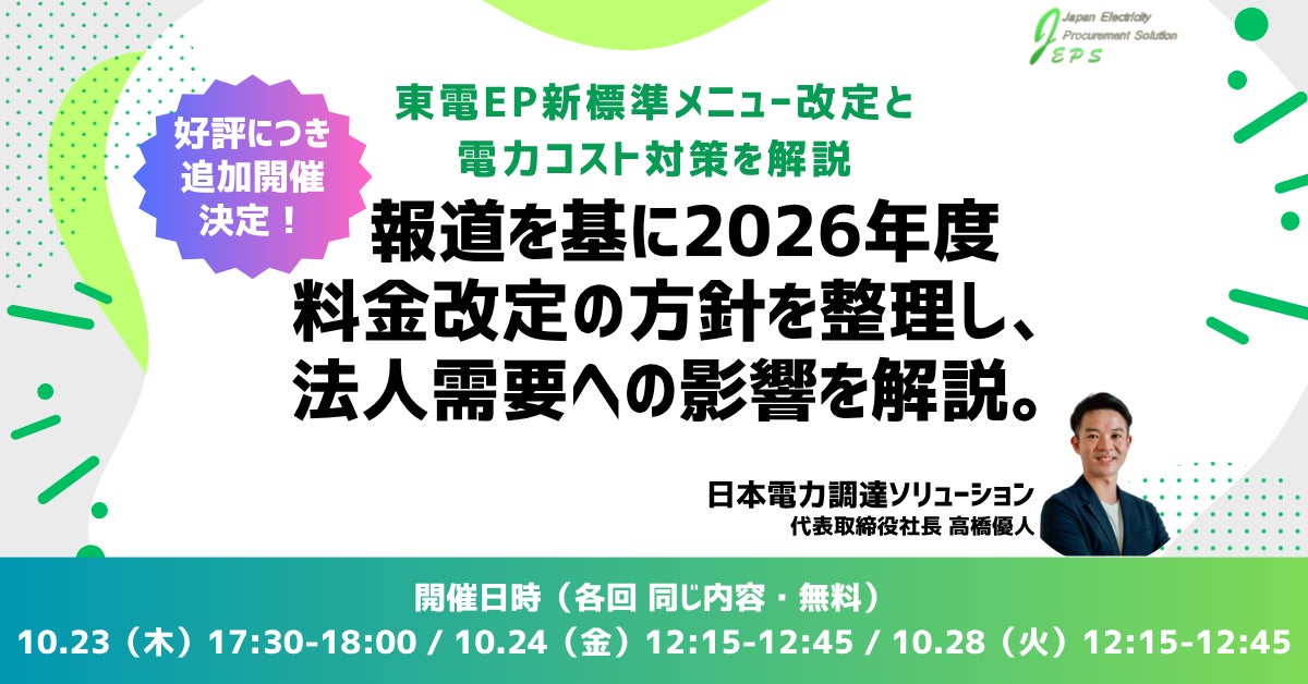 法人向けに電力契約・再エネ調達支援を行う 株式会社日本電力調達ソリューション(本社:東京都港区、代表取締役社長:高橋優人、以下「当社」)は、報道ベースで注目されている東京電力エナジーパートナー(東電EP)の新標準メニュー料金改定をテーマにした無料オンラインセミナーを、ご好評につき追加開催いたします。