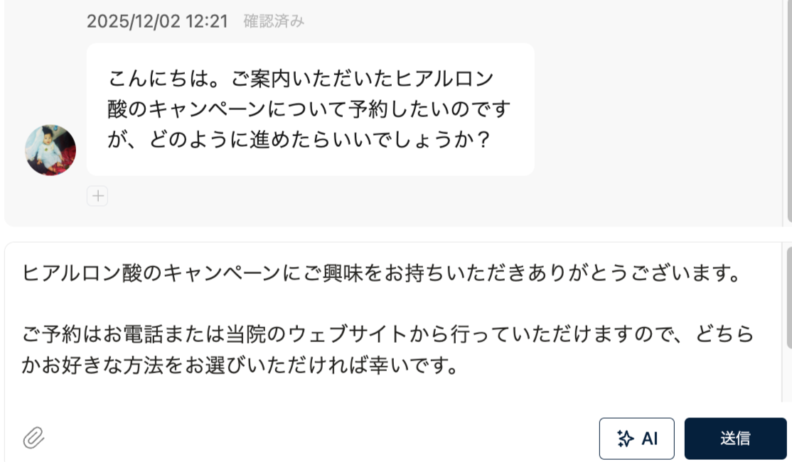 本リリースの目玉となるのが、生成AIによる「返信アシスト機能」です。 単なる定型文の呼び出しではなく、患者様との過去のやり取りや文脈、直前の質問内容をAIが解析。「推奨される返信内容」を自動で生成・提案します。スタッフはAIが作成した下書きを確認・タップするだけで返信が完了するため、経験の浅いスタッフでも熟練者レベルの対応が可能になります。