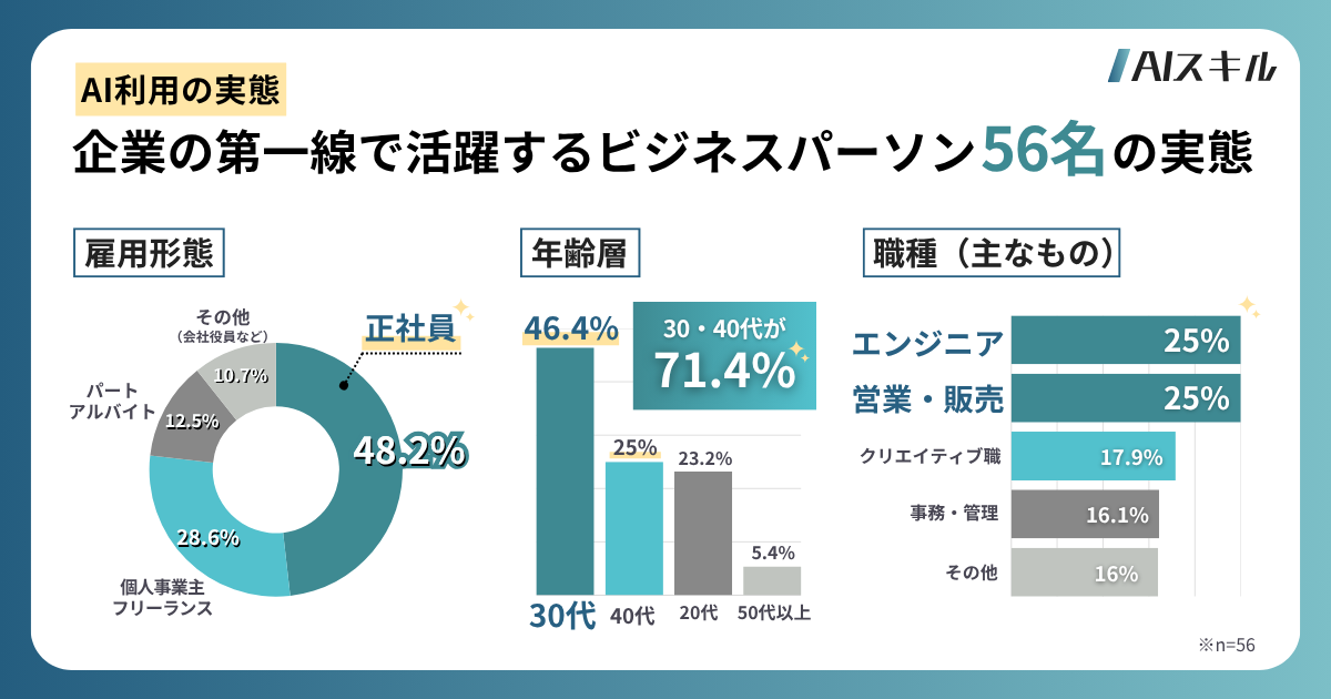 本調査では、AIエージェントを試験的に導入しているビジネスパーソン56名から回答を得ました。
