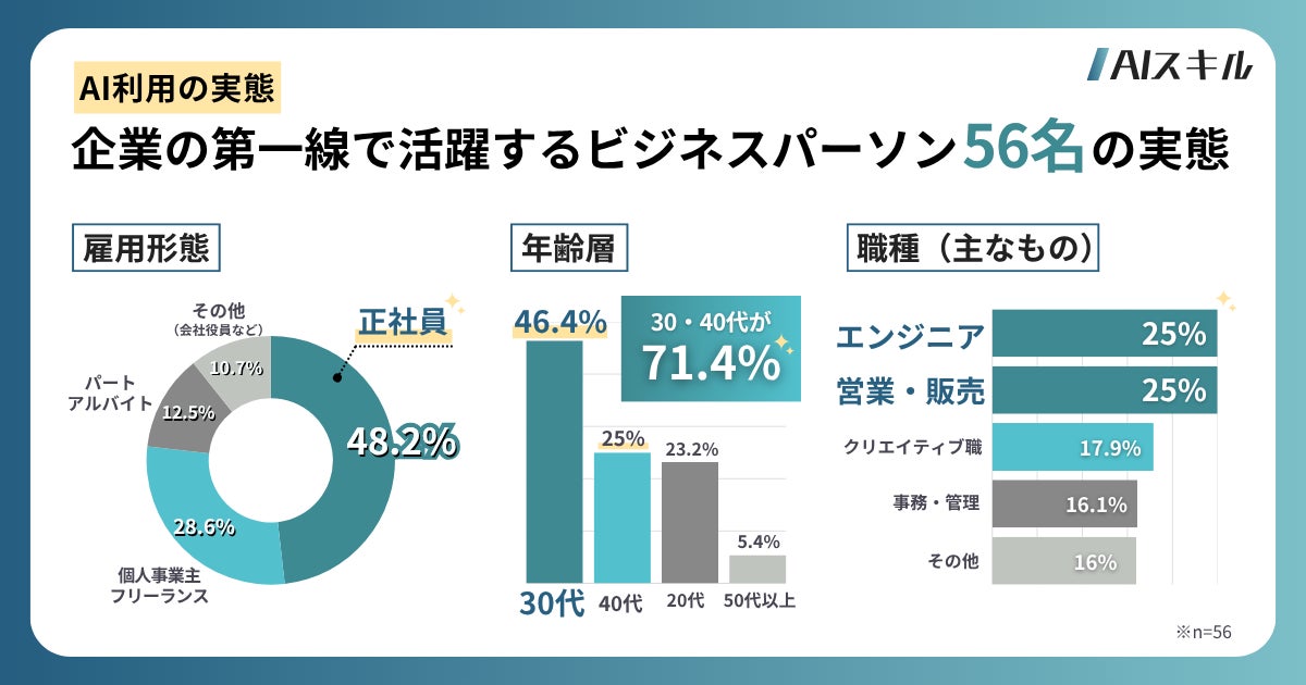 年齢層は30代(46.4%)を中心に20代〜40代の働き盛りの世代が9割以上を占め、職種もエンジニア(25.0%)や営業・販売(25.0%)など多岐にわたります。