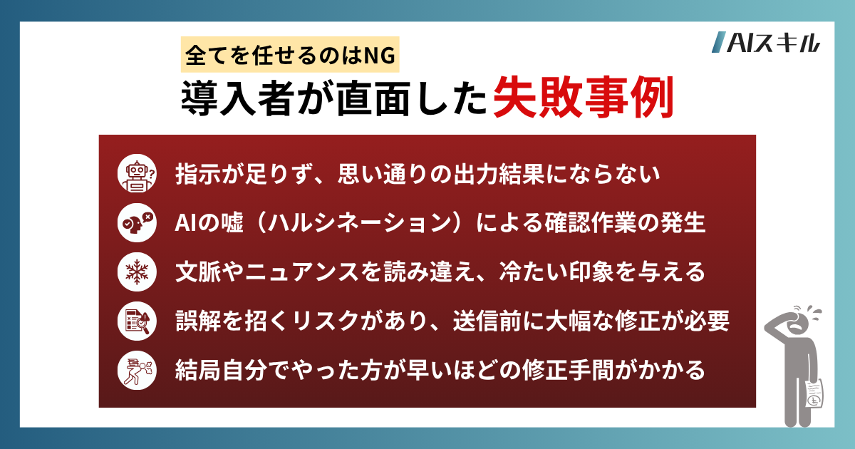 相手の感情や文脈への配慮が不可欠な対人業務では、「AIは下書きまで、最終確認と送信は人間」という線引きが必要となります。