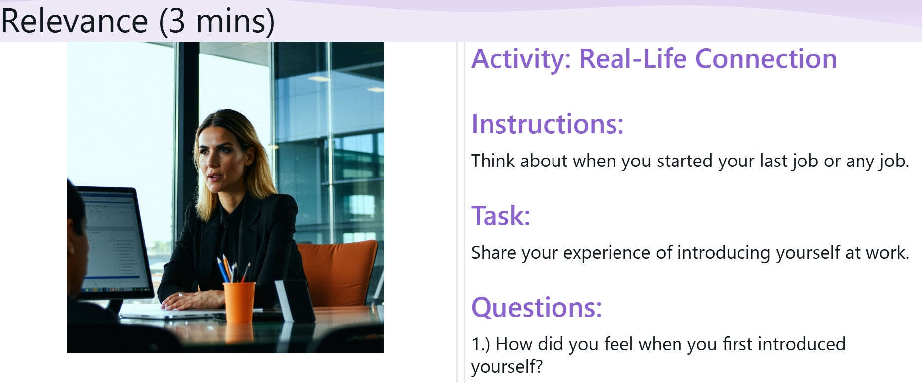 Relevanceパートでは「上司に報告する」「取引先に要望を伝える」など実際のビジネスで起こるケースと学習との関連性を想起させます。