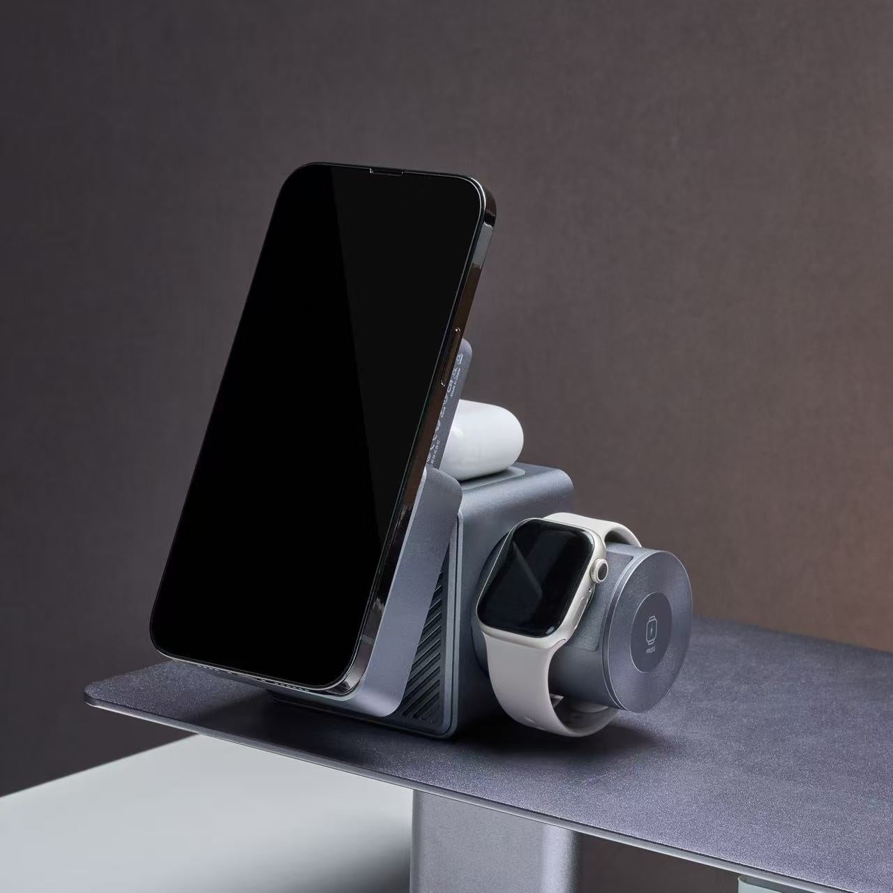 iPhone、AirPods、Apple Watchを同時にワイヤレスで充電できるほか、iPhone用充電器は取り外してモバイルバッテリーとしても使用可能です。