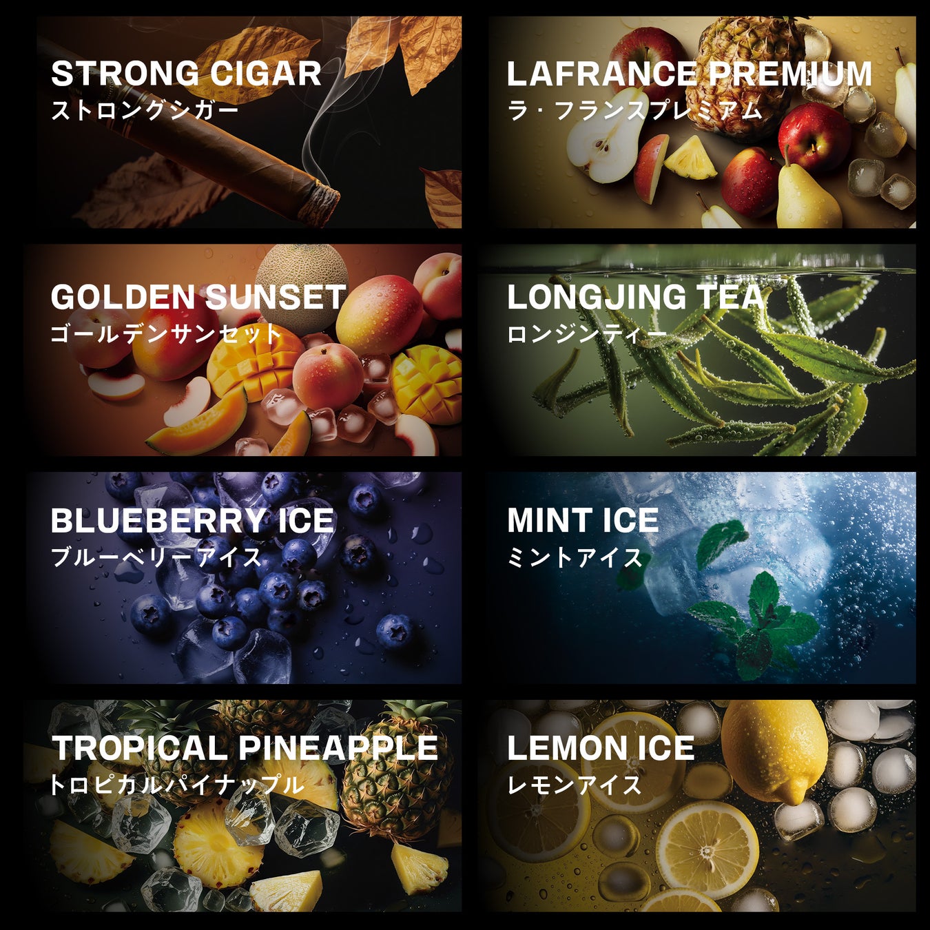 甘さ重視のフルーツ系からガツンとくるシガー系まで、喫煙者一人ひとりの好みに応える豊富なラインナップを展開します。