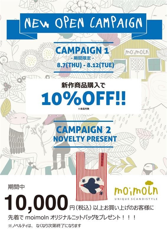 本ポップアップストアでは、秋の新作や日本限定アイテムをいち早くご覧いただけるほか、現在販売中の夏の人気アイテムも多数展開いたします。また新作や通常価格の商品をご購入のお客様には、レジにてお買い上げ金額より10%OFFとなる、ポップアップストア限定のスペシャルプライスを適用。さらに京王百貨店新宿店で大変ご好評をいただいたノベルティ「モイモルン オリジナルニットバッグ」が再登場するなど、ポップアップストアならではのイベントをご用意しております。