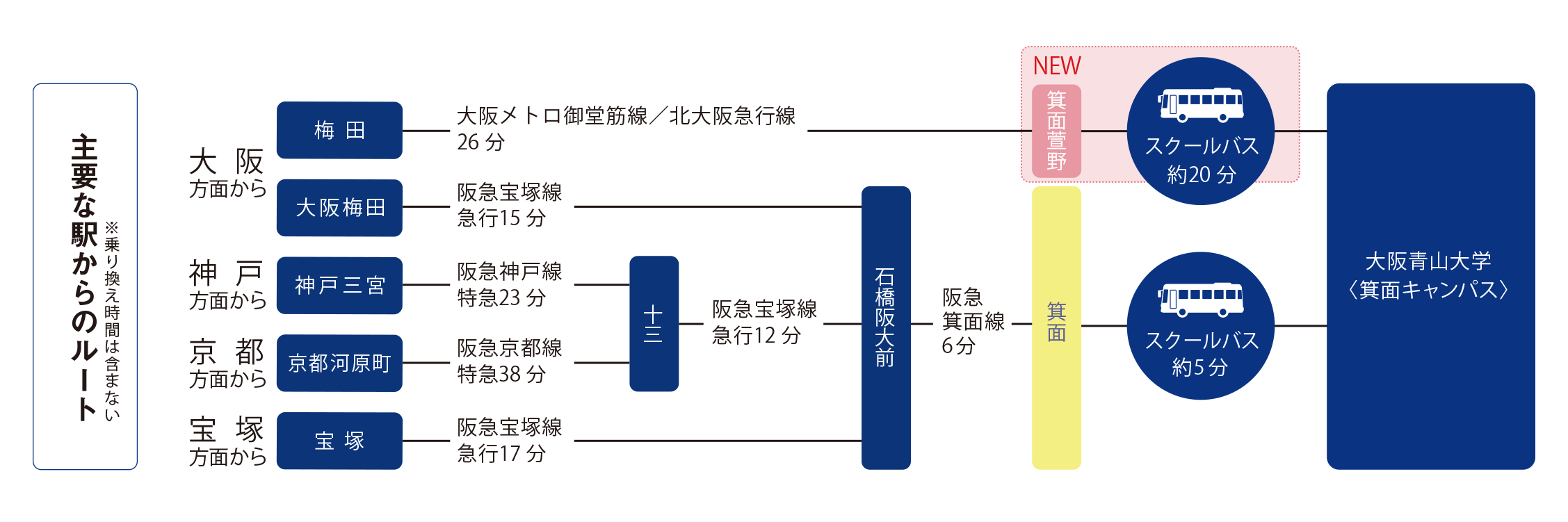 阪急電鉄「梅田」駅より宝塚線「石橋阪大前」駅乗り換え箕面線「箕面」駅(約25分)下車、西へ 1.3km、またはスクールバス約 5 分