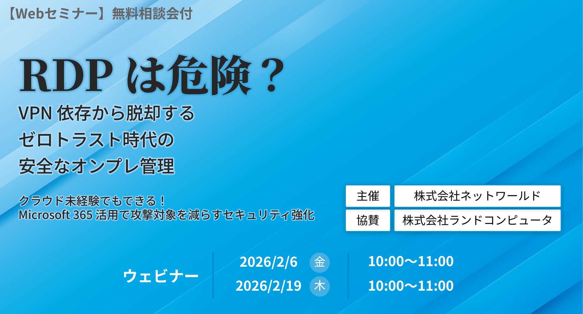 2026年2月6日(金)と2月19日(木)の2回、株式会社ランドコンピュータ(本社:東京都港区)は、Webセミナー「RDP は危険?VPN 依存から脱却するゼロトラスト時代の安全なオンプレ管理~クラウド未経験でもできる!Microsoft 365 活用で攻撃対象を減らすセキュリティ強化~」を共催いたします。