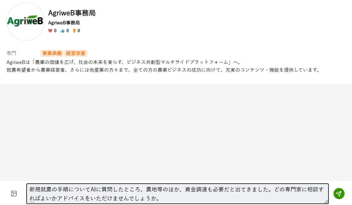 農業者を支援したい各分野の専門家にチャット形式で連絡可能な機能。