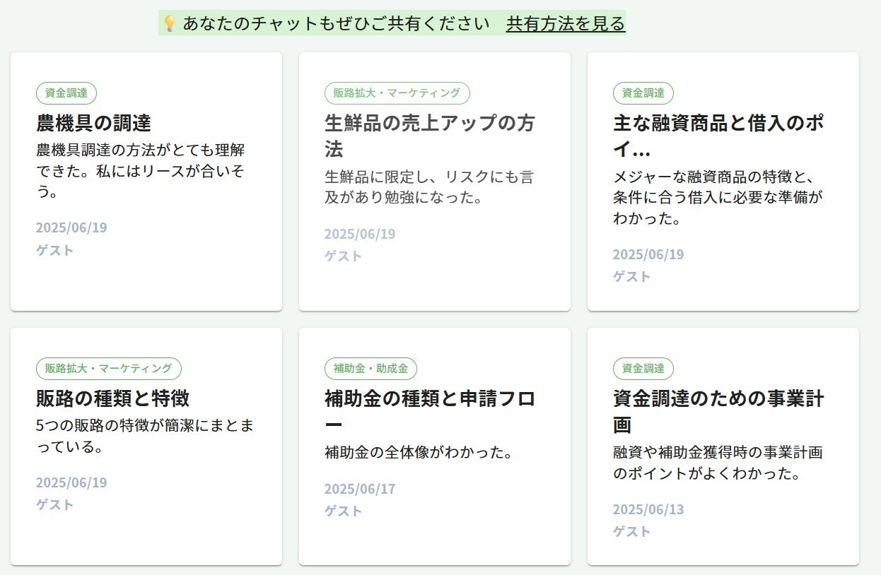 AI上になされた他の農業者の質問を閲覧できる機能を有しており、自身の経営課題を認識するヒントとしても活用可能。