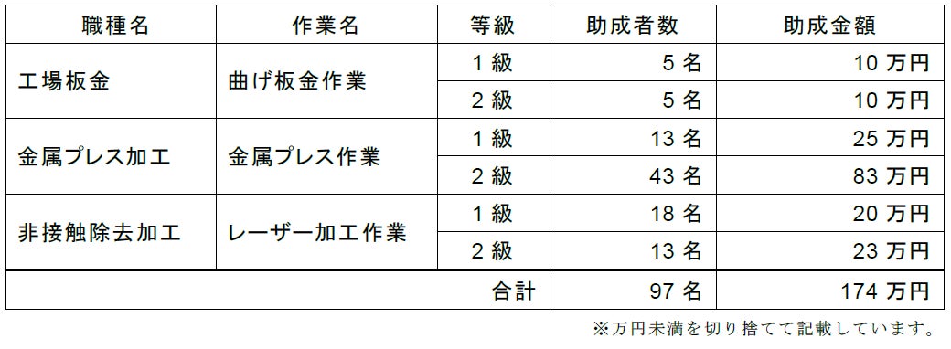助成先人数は97名(32団体)、助成金総額は174万円です。内訳は、曲げ板金作業が助成人数10名(1団体)助成金額は20万円、金属プレス作業が助成先人数56名(15団体)、助成金額は108万円、レーザー加工作業が助成先人数31名(16団体)、助成金額は43万円です。