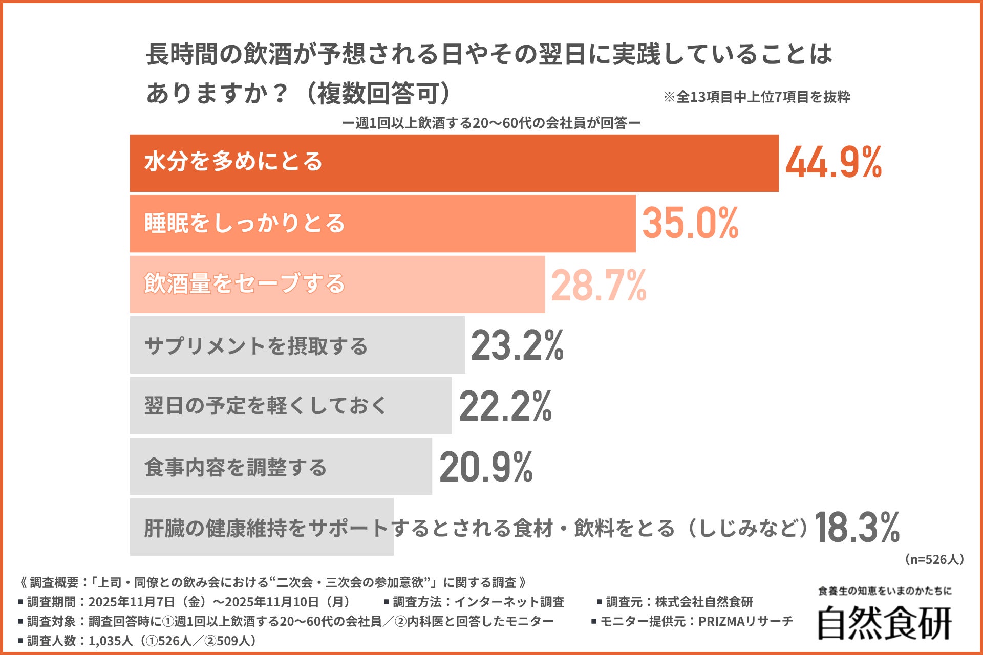 そこで今回、株式会社自然食研(https://www.sizenshokken.co.jp/)は、①週1回以上飲酒する20〜60代の会社員/②内科医を対象に、「上司・同僚との飲み会における“二次会・三次会の参加意欲”」に関する調査を行いました。