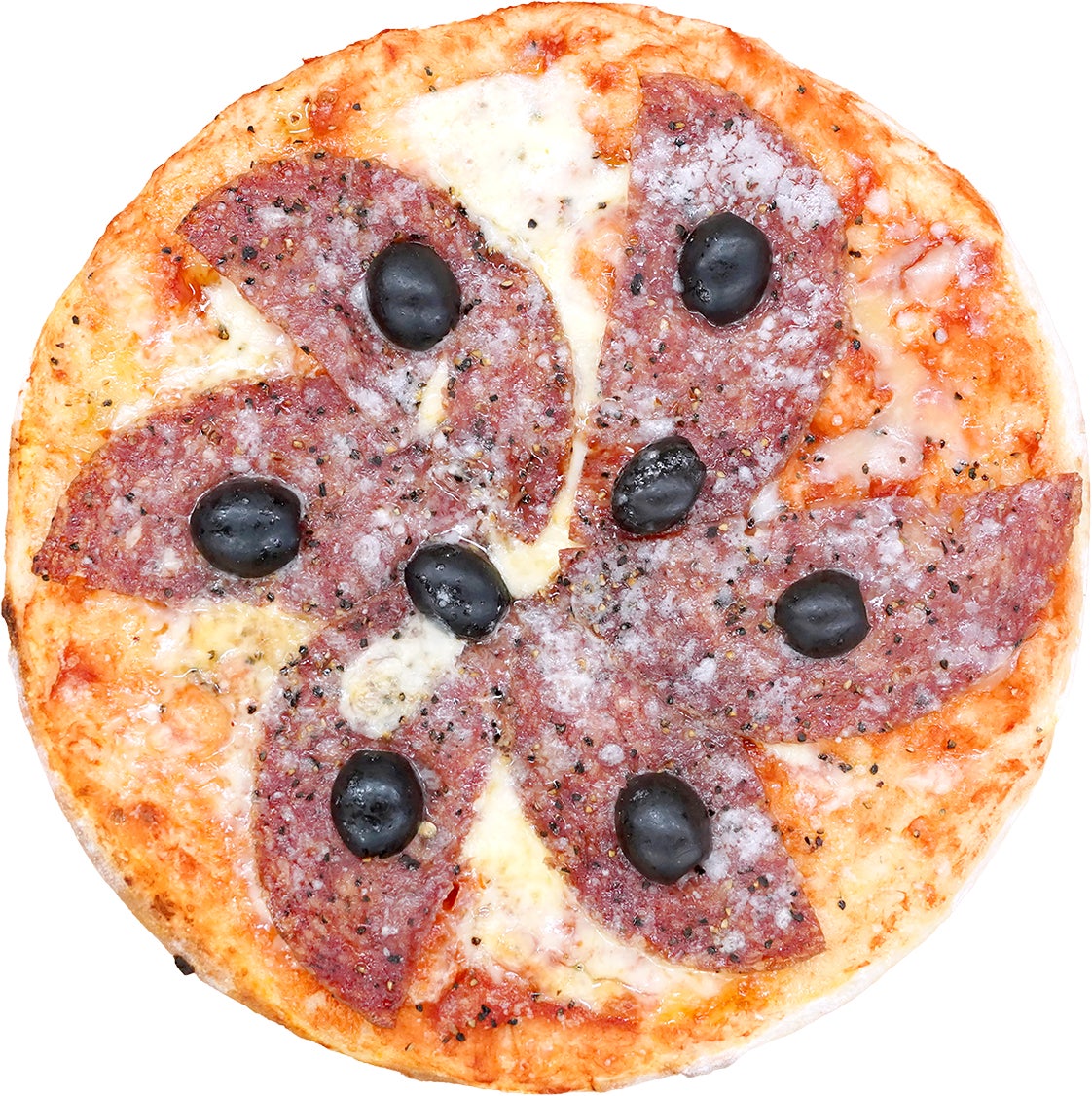 イタリア産のノンスモークサラミは、黒トリュフの香りが上品に香る贅沢な味わい。アメリカ産の種抜きライプオリーブは歯応えの良さが人気です。薄いローマ風のピザ生地なので、前菜やおつまみにもぴったりです。