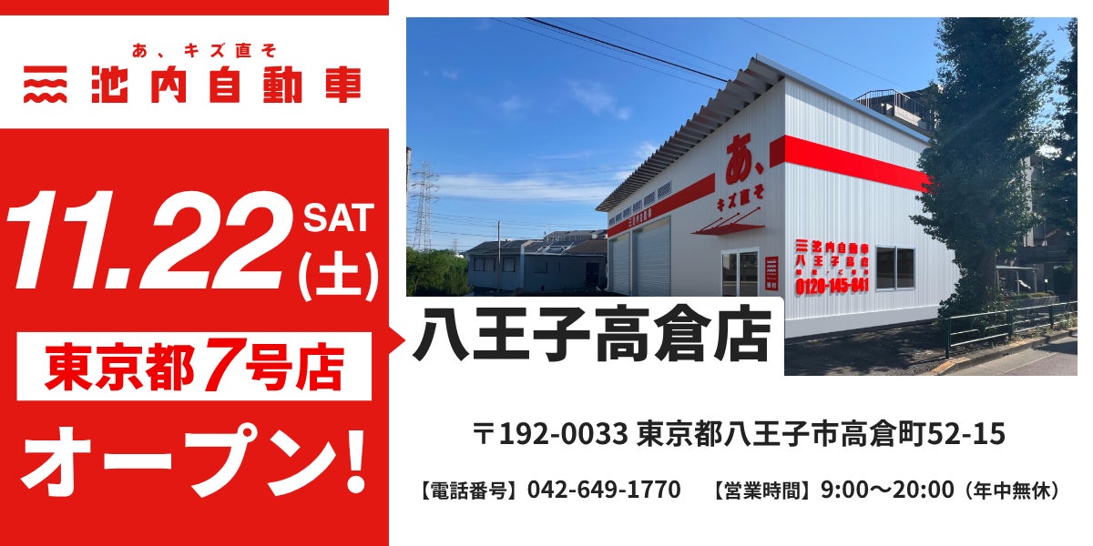 自動車の板金塗装事業を手掛ける株式会社イケウチ(本社:東京都千代田区、代表取締役社長:池内 美友、以下「当社」)は、2025年11月22日(土)に池内自動車 八王子高倉店(東京都八王子市)をオープンいたします。