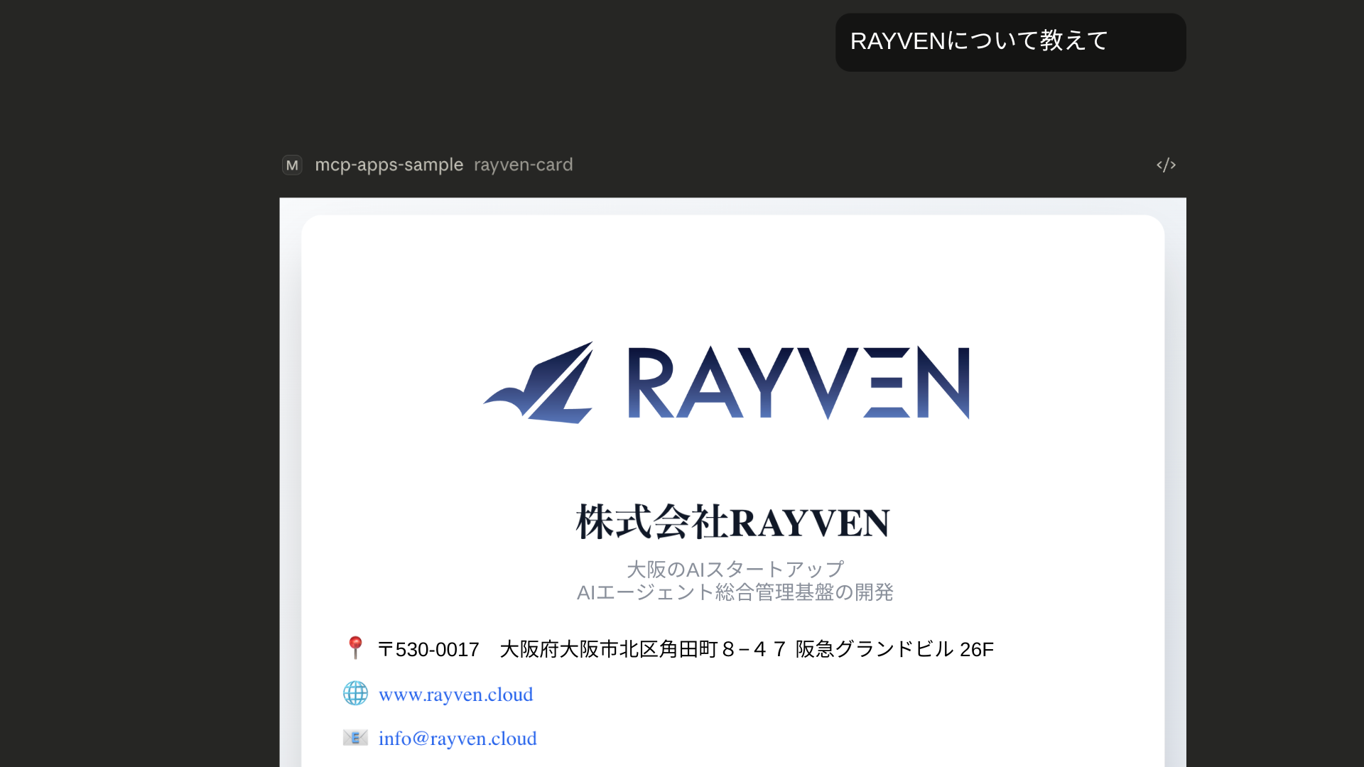 株式会社RAYVEN(本社:大阪府大阪市、代表取締役:鈴山佳宏)は、AIチャット画面内で動作するリッチUIアプリケーション「MCP Apps」の開発支援サービスを、Anthropic社のClaudeにも対応拡充いたします。2025年10月より提供中のChatGPT(Apps in ChatGPT)向け開発支援に加え、2026年1月26日に正式リリースされたClaude向けMCP Appsにも対応。