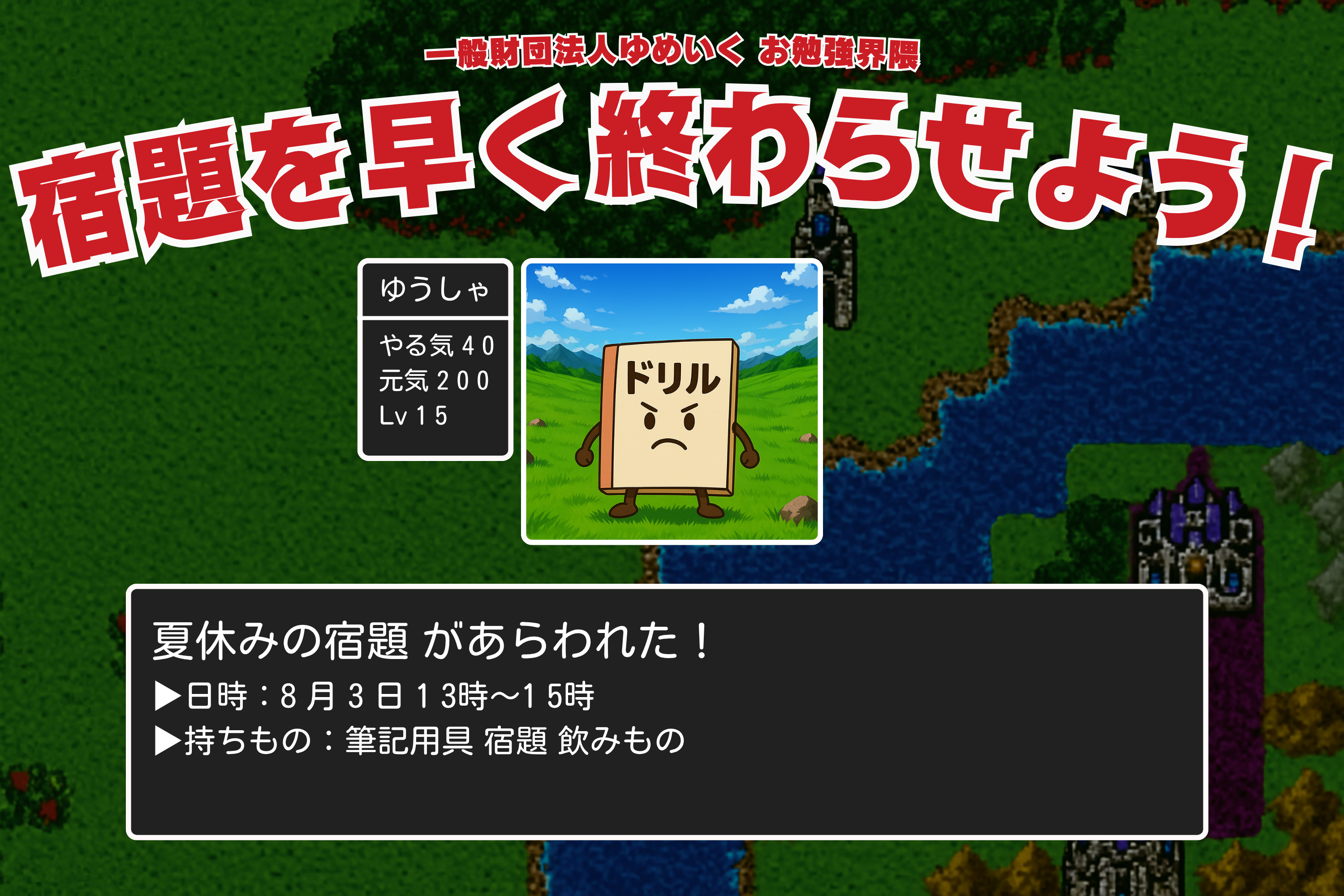 一般財団法人ゆめいくが運営する学びの居場所「お勉強界隈」では、夏休み中の子どもたちを対象に、宿題に集中して取り組める特別イベントを2025年8月3日(日)に開催します。
