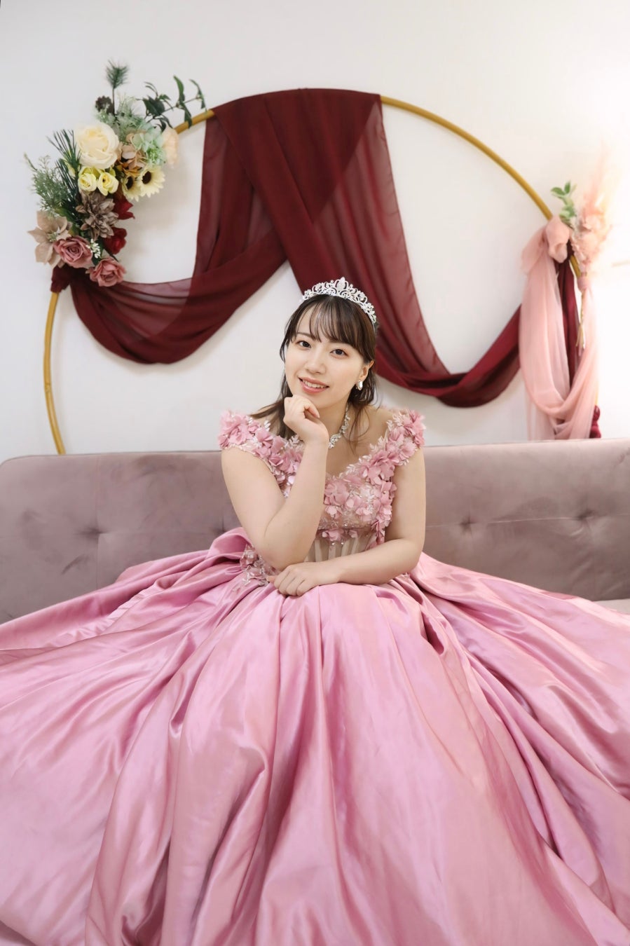 ・ドレスを着られる機会がこれまでなかった上、ソロウェディングをやろうと思っても手の出しにくい値段が多く諦めていました。”#推しの隣でドレス着るなら”というキャッチコピーにも惹かれ、お気に入りの推しグッズと一緒に撮影できて、一生分の「かわいい!」を言われながらの撮影は夢のような2時間でした...!(20代女性)