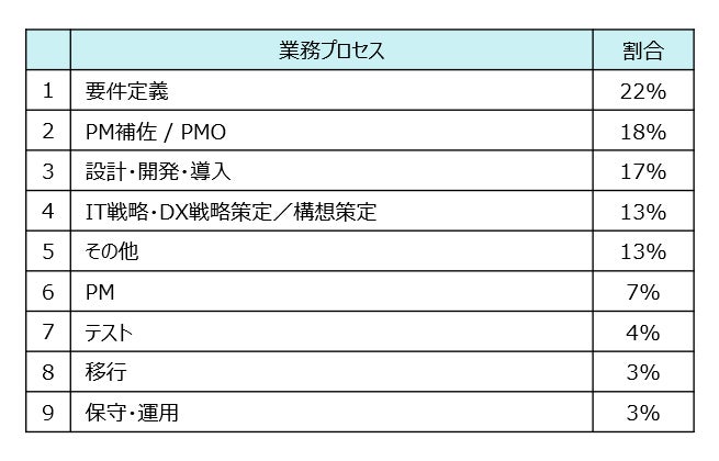 業務プロセス別の案件数では、要件定義が22%で最多となり、次いでPM補佐/PMOが18%、設計・開発・導入が17%という結果でした。IT戦略・DX戦略策定/構想策定とその他はいずれも13%、PMが7%、テスト4%、移行3%、保守・運用3%と続きます。