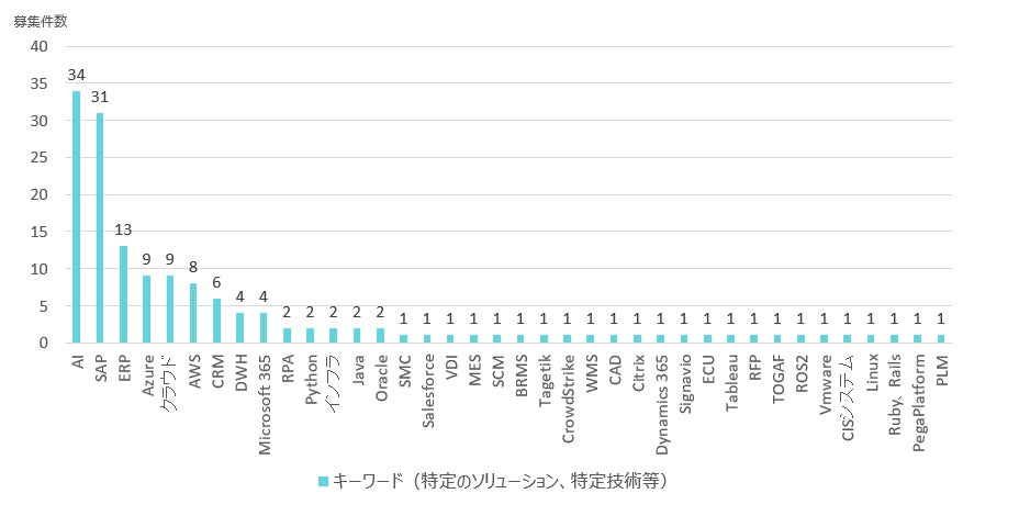 最も多く登場したのは「AI」(34件)および「SAP」(31件)で、次いで「ERP」「Azure」「クラウド」「AWS」など、業務・インフラ双方で主要なプラットフォーム技術が並びました。