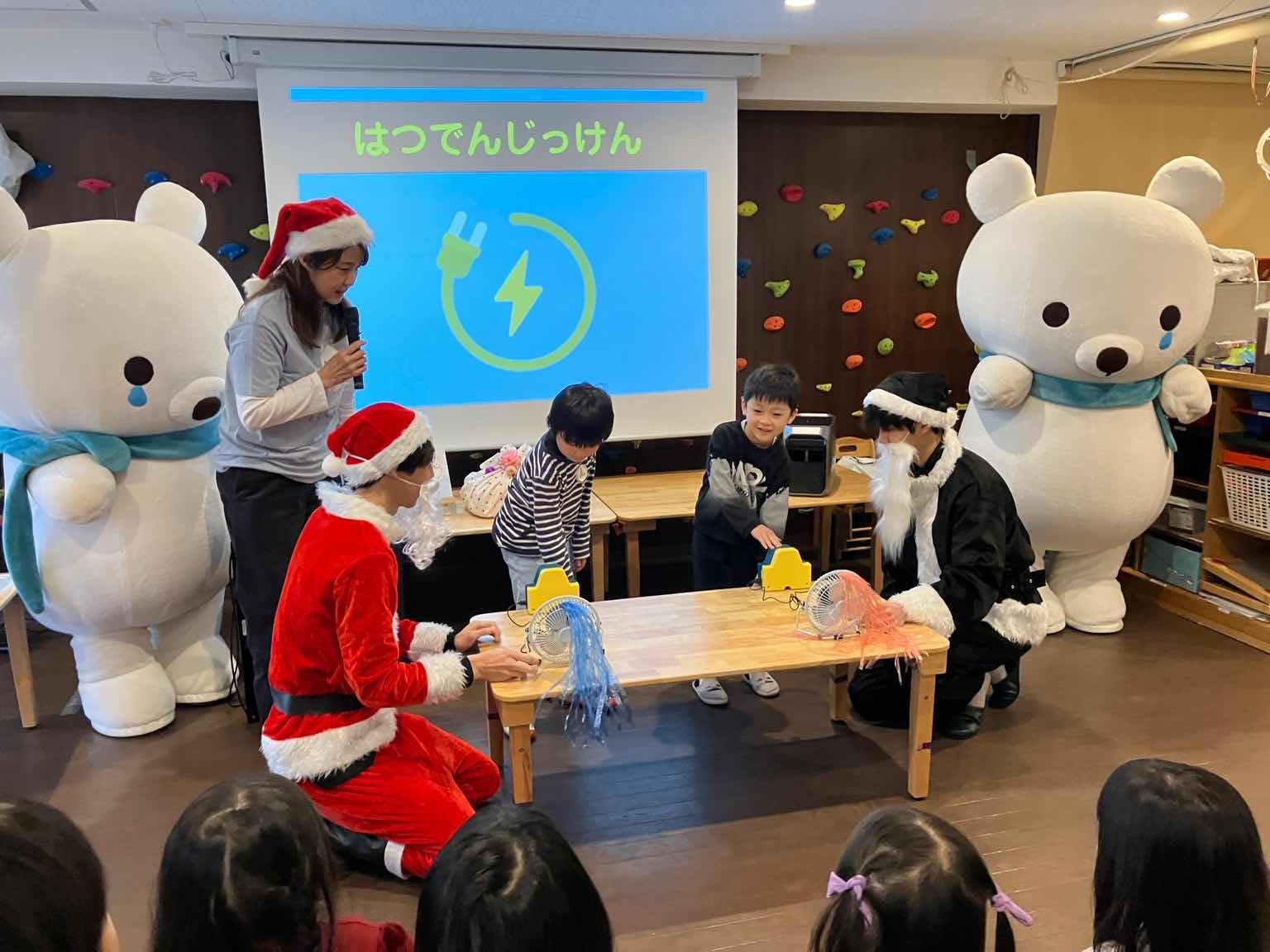 ワークショップでは、北極グマのキャラクター「そら」と「べあ」のお話を通して、地球温暖化や自然エネルギーの大切さについて、子どもたちにもわかりやすく学びました。キャラクターの登場に、子どもたちは目を輝かせながら楽しそうにお話に耳を傾けていました。
