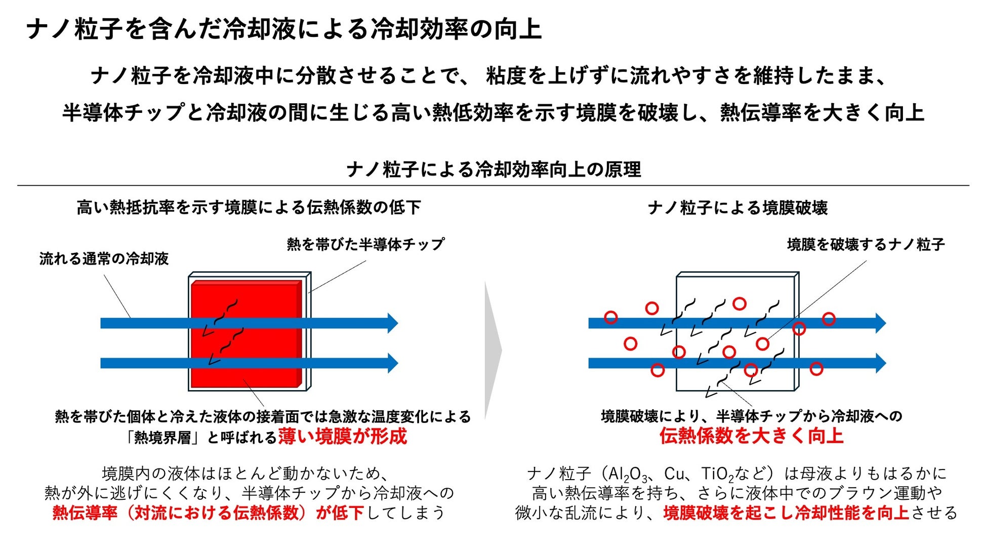 NanoFrontierは、東北大学で長年培われた再沈殿法を産業実装向けに改良し、炭素系・金属酸化物系などのナノメートル級単分散粒子を、難燃・高絶縁ベースオイルへ高濃度かつ長期安定で分散させる独自技術を保有しています。粒子の微視的な運動と流体の攪拌効果により熱境界層を実質的に弱め、対流伝熱を底上げしつつ、粘度上昇を抑える処方最適化を進めています。