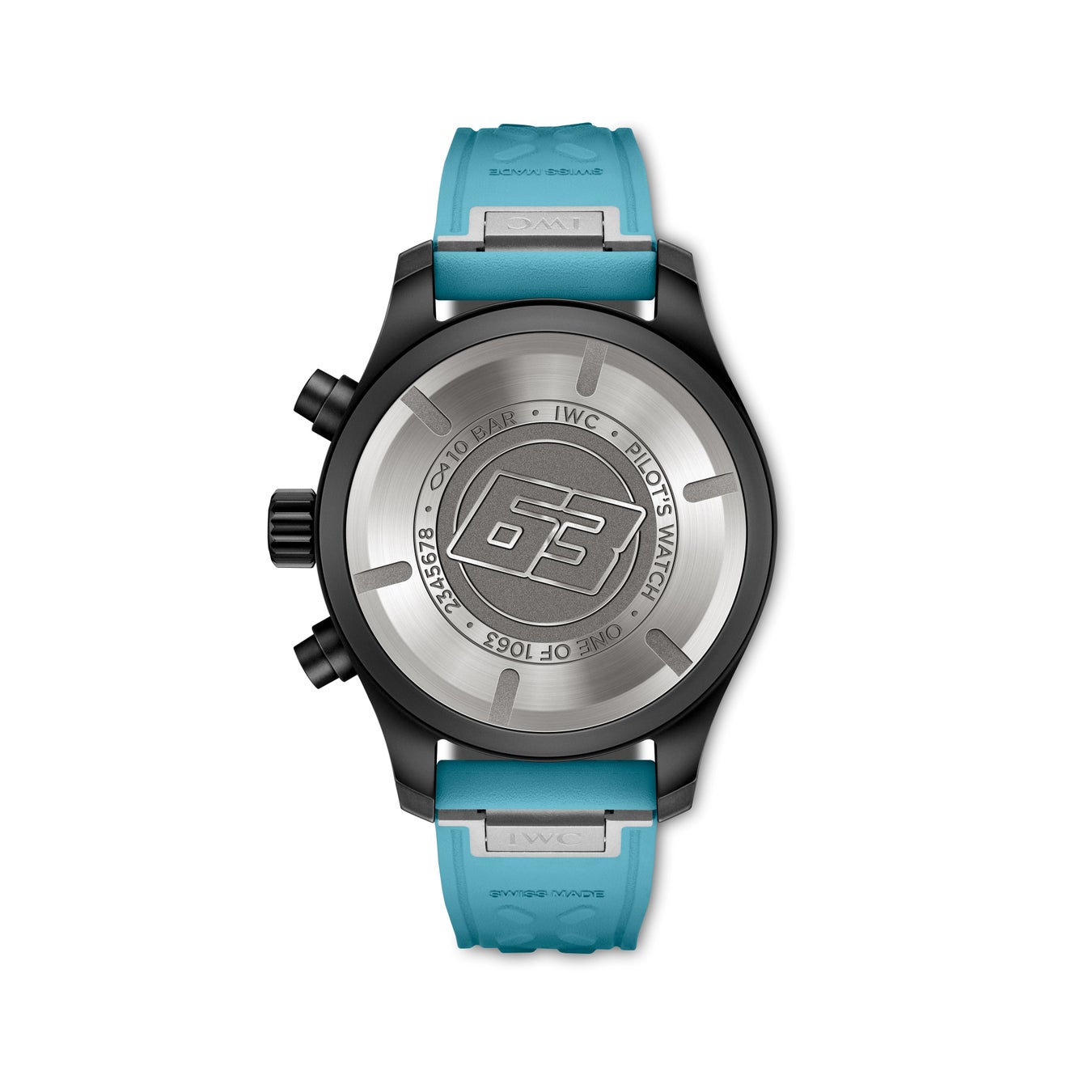 どちらのモデルともチタン製の裏蓋には、彼が幼い頃に勝利を重ねたレーシングカート選手権からF1に至るまで使用したカーナンバー「63」が刻印されています。また、クロノグラフと自動巻きモデルには、文字盤と同じ特徴的なブルーの色合いのラバーストラップ(セラタニウム®製ピンバックル付き)が組み合わされます。内蔵されたEasX-CHANGE®システムにより、工具を必要とせずに、すばやく簡単にストラップを交換することができます。