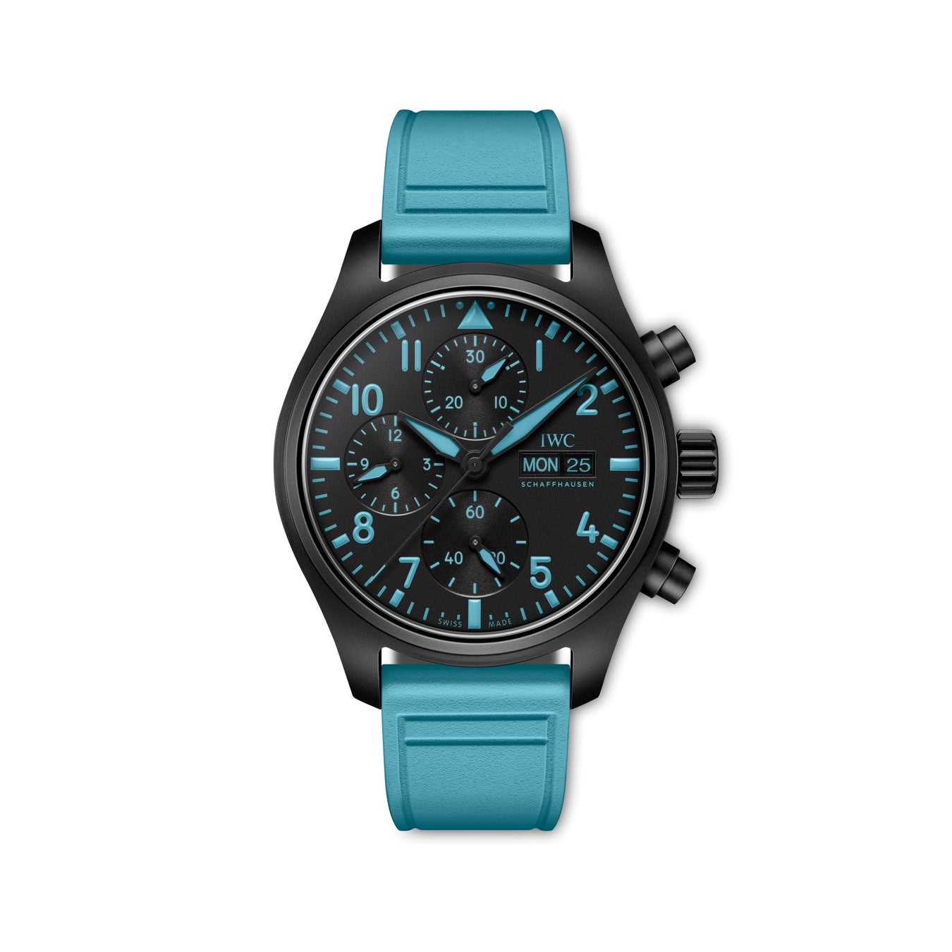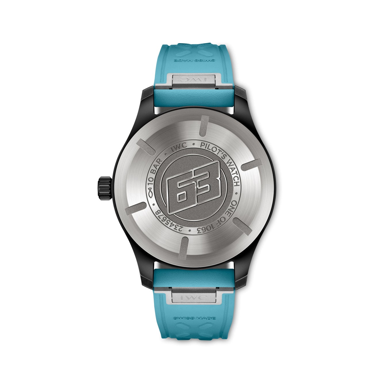 One. Teamのドライバー、ジョージ・ラッセルとコラボレーションし、パイロット・ウォッチの2つの限定モデルを発表します。クロノグラフと自動巻きモデルの、いずれもブラックの酸化ジルコニウム・セラミックを採用し、ラッセルのヘルメットに見られる特徴的なブルーカラーを取り入れて、ブラックの文字盤には暗所で発光する印象的なカラープリントが施されています。チタン製の裏蓋には、ドライバーのカーナンバー「63」が刻印されています。クロノグラフはキャリバー69380、自動巻きモデルは