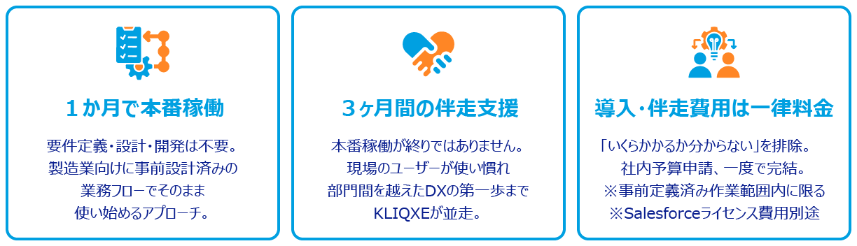 KLIQXE SMB Manufacturing ONEは、世界No.1* CRM Salesforceを「中小製造業が無理なく使い始められる形に」という一点に集中して設計した、これまでになかったアプローチのサービスです。。