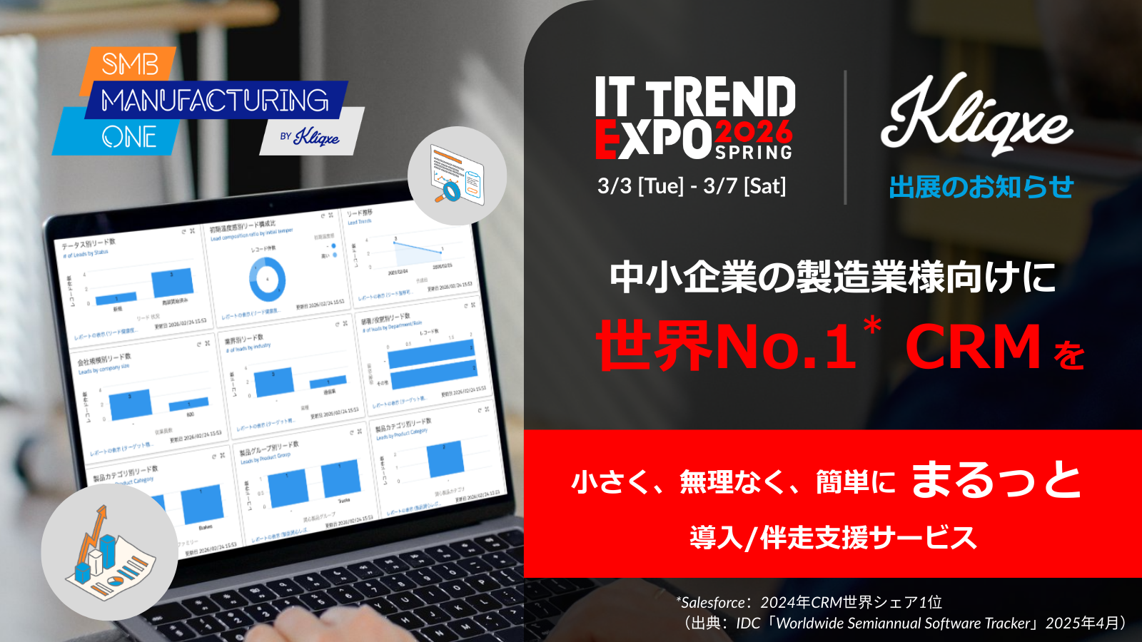 グローバルで唯一製造業に特化したSalesforceコンサルティングパートナーのKLIQXE株式会社(本社:東京都文京区、代表取締役:木村靖史、以下「KLIQXE」)は、2026年3月9日(月)より提供開始予定の新サービス「KLIQXE SMB Manufacturing ONE」を、参加経験率No.1**のオンライン展示会「ITトレンドEXPO2026 Spring」(2026年3月3日〈火〉〜 3月7日〈土〉)の「営業・マーケティング」関連展示エリア内にて「KLIQXE SMB Manufacturing ONE」を出展いたします。