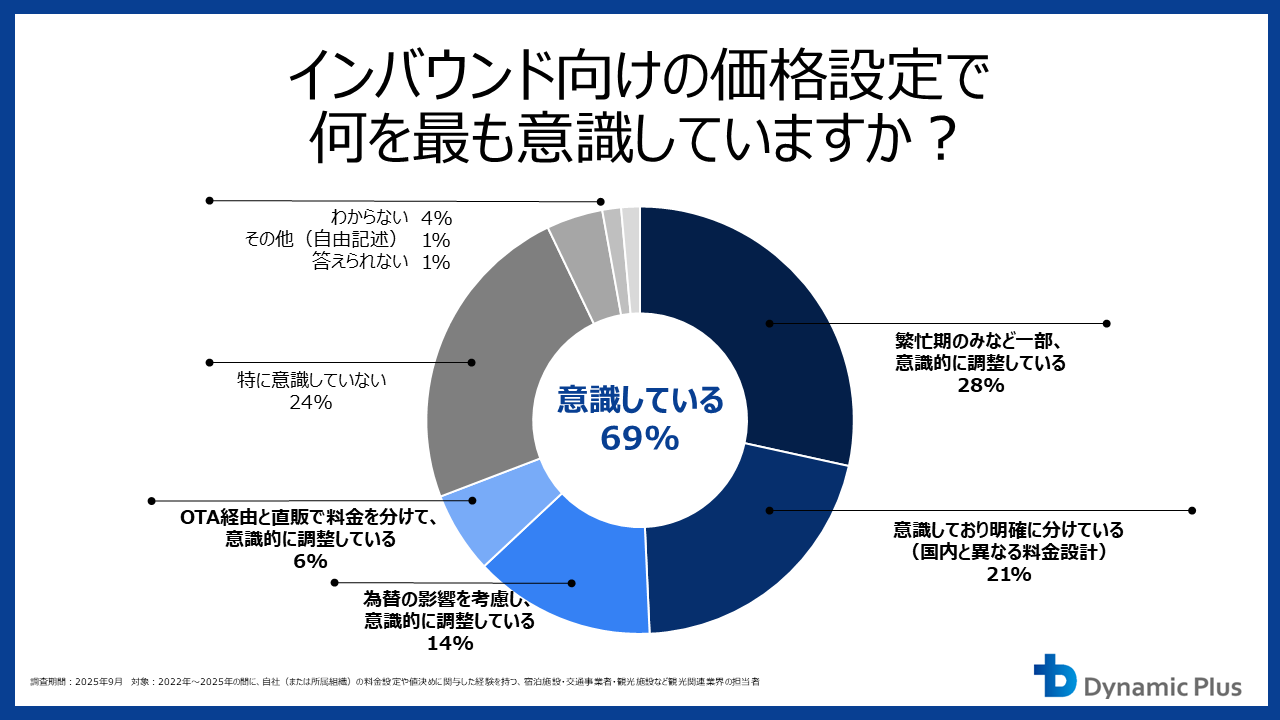 インバウンド向けの価格設定について、「意識している」と回答した企業は全体の69%に上りました。