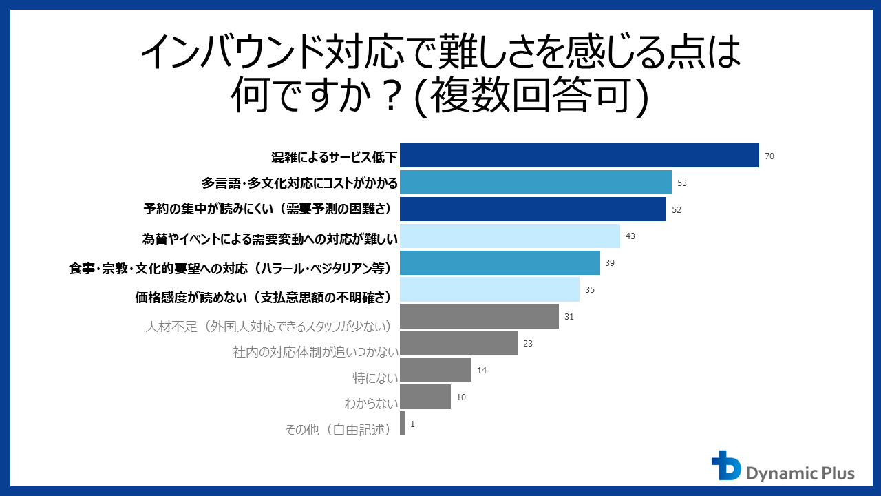 インバウンド対応で難しさを感じる点として、最も多かったのは「混雑によるサービス低下」。次いで「多言語・多文化対応にコストがかかる」、「予約の集中が読みにくい」が続きました。