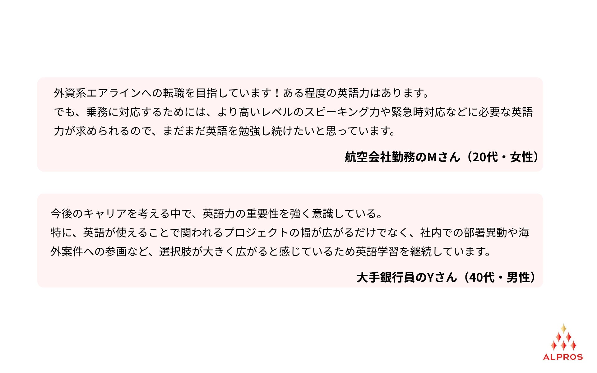 実際に、アルプロスが行った受講者インタビューでは、以下のような声が寄せられていました。