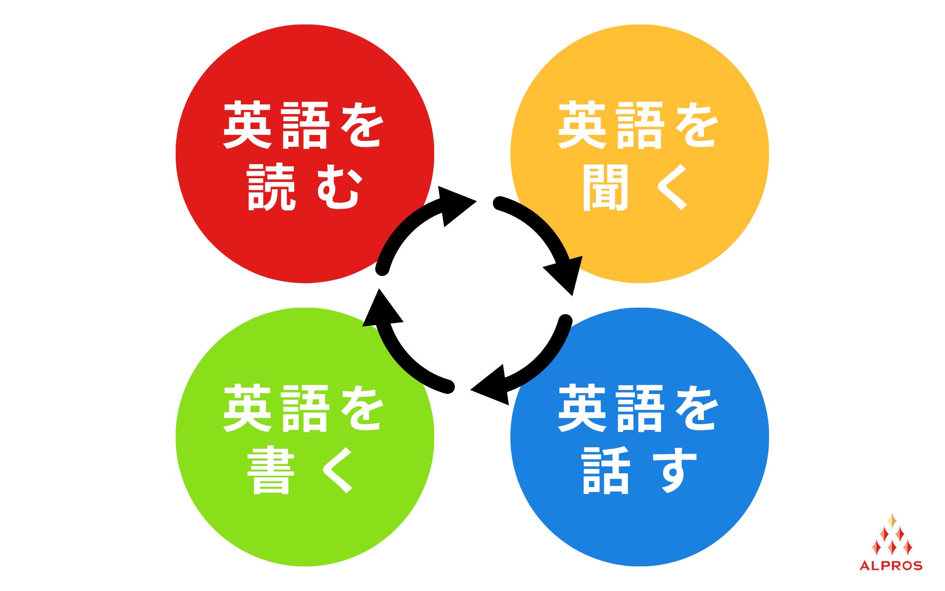 アルプロスの英語学習が一般的な学習法と異なるのは、「読む・聞く・書く・話す」の4技能すべてを1つの教材で同時にトレーニングする設計にあります。